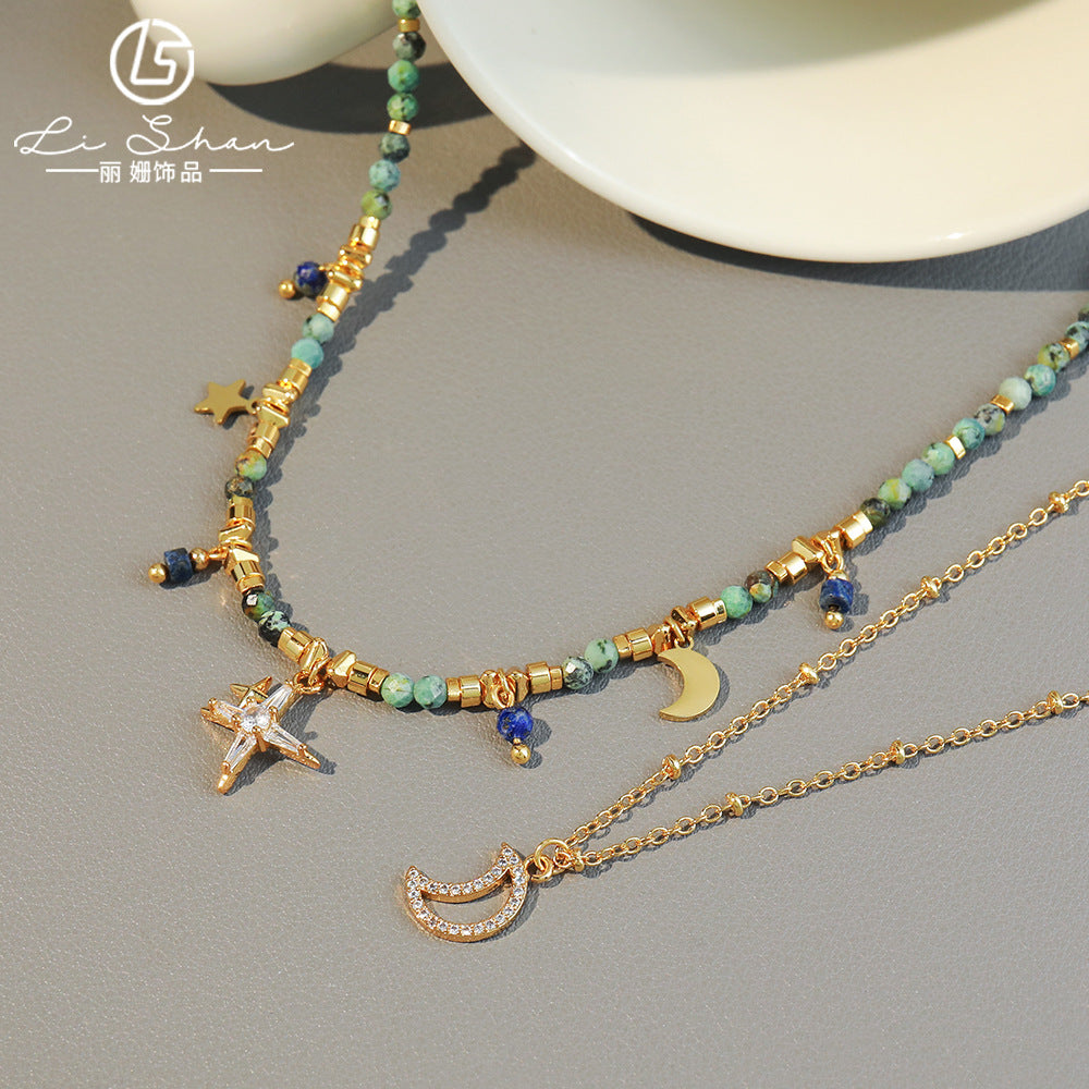 Bohemian Versatile Niche African Turquoise Handmade Beaded Necklace Moon Pendant Premium Sense Stacked Collarbone Chain