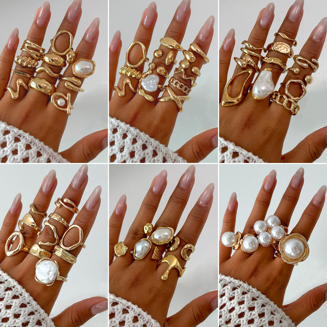 European and American personality exaggerated imitation pearl ring hand jewelry, retro irregular liquid lava ring set
