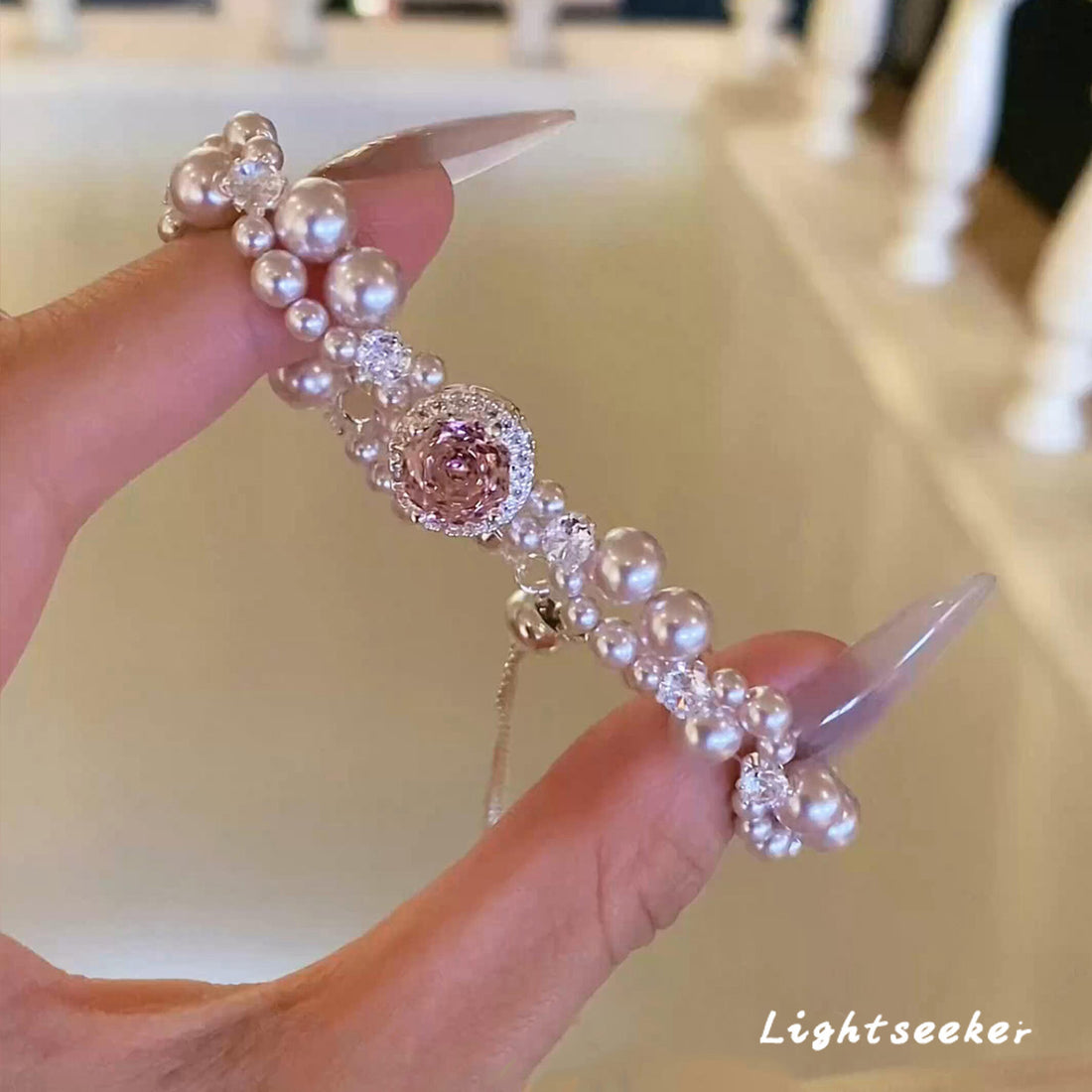 French temperament flash pink rose flash diamond pearl bracelet female sweet fashion exquisite high value jewelry