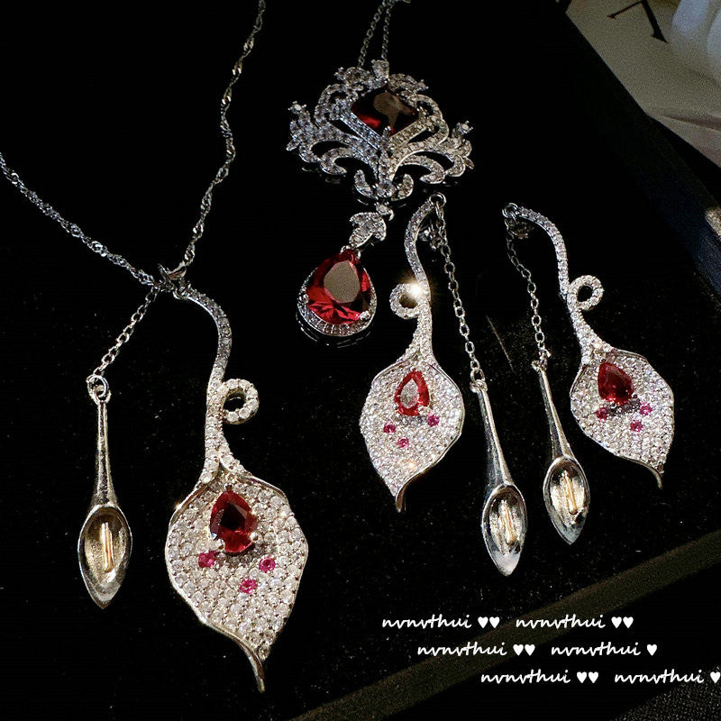 Kardashian burgundy flower gemstone necklace, designer plated 18K gold pomegranate droplet zircon calla lily earrings