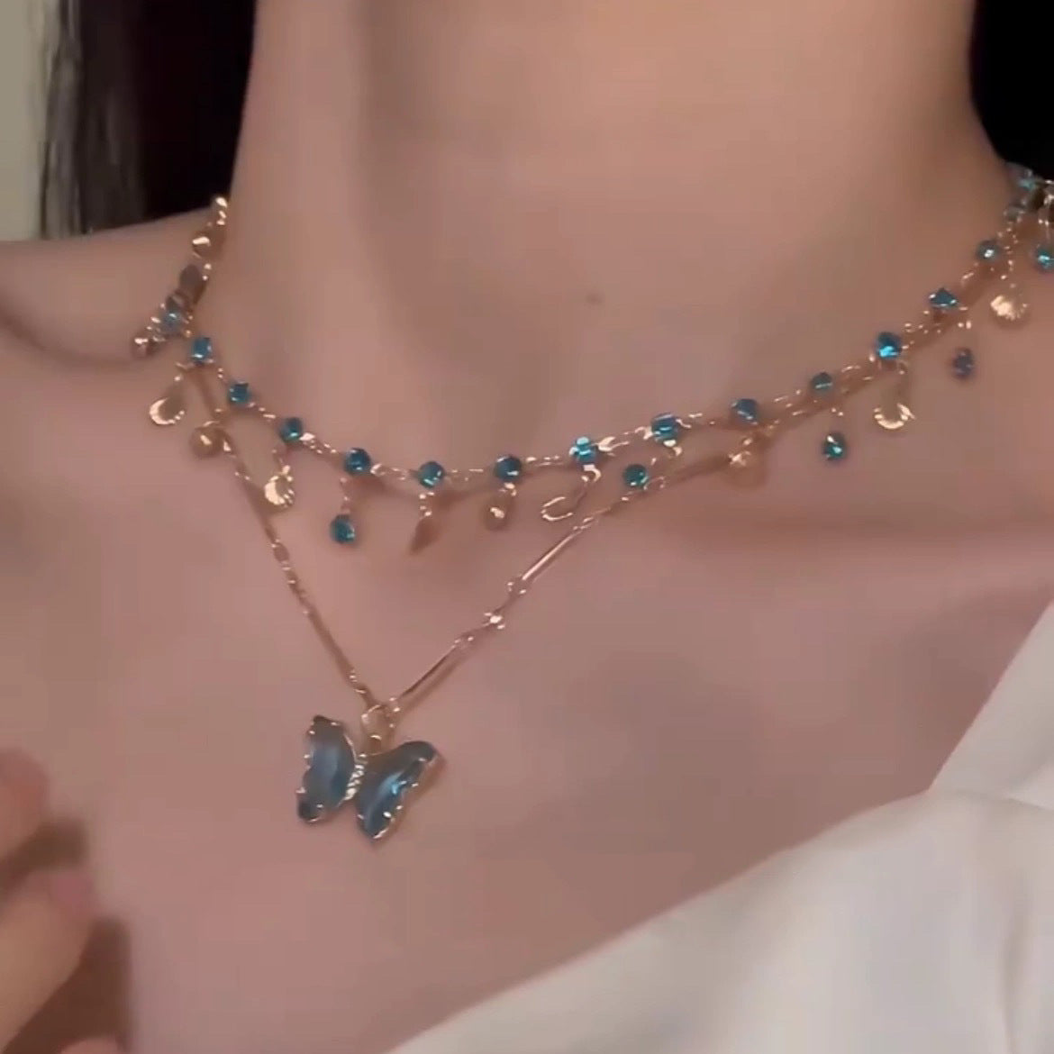 "Blue Butterfly Love" Blue Butterfly Necklace Women's 2024 New Popular Double Layer Stacked Clavicle Chain Accessories Women