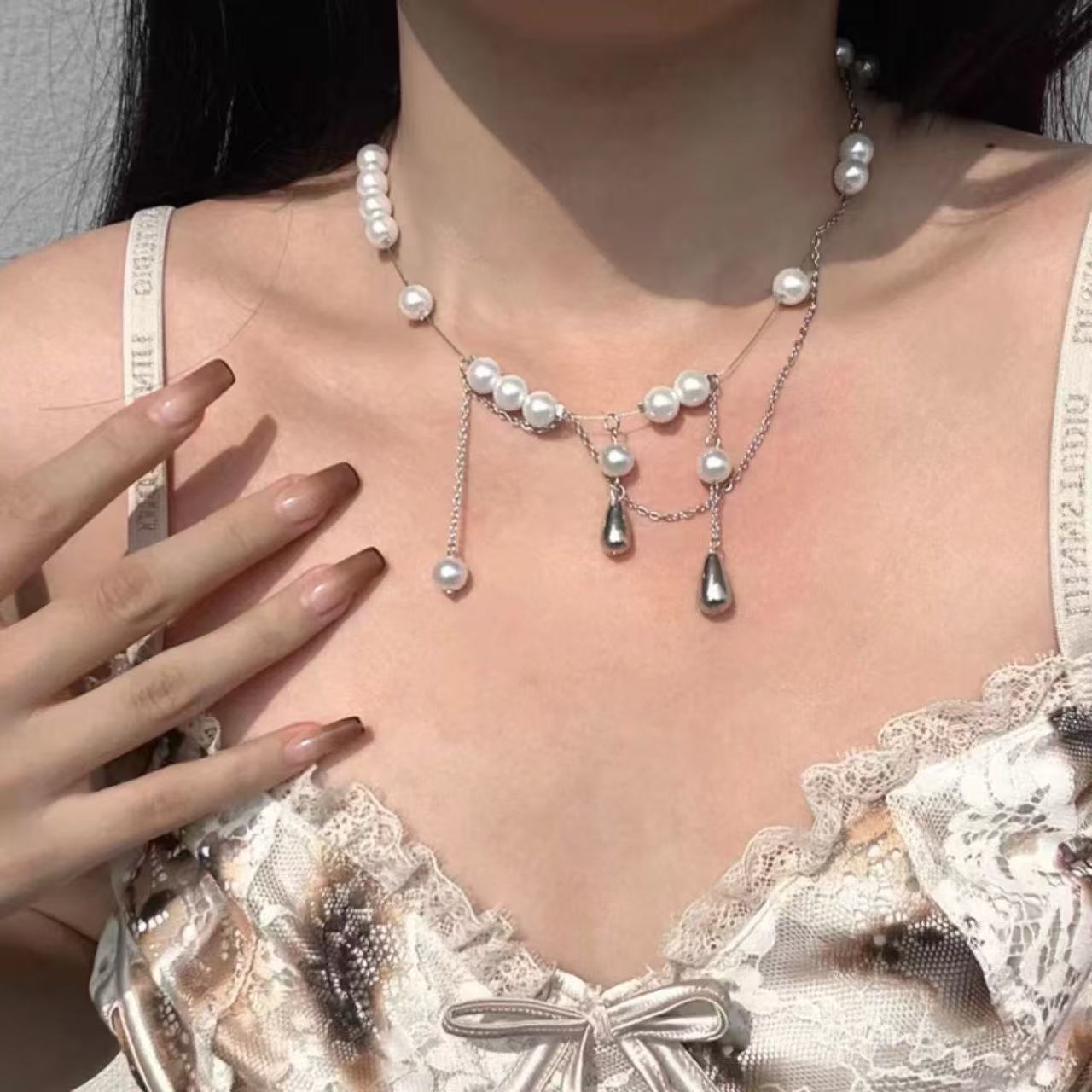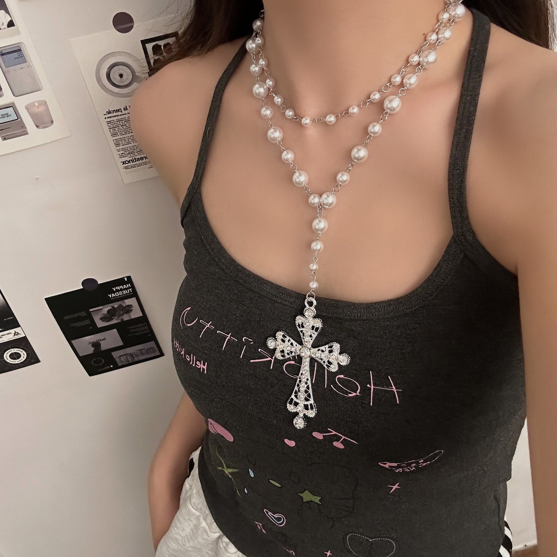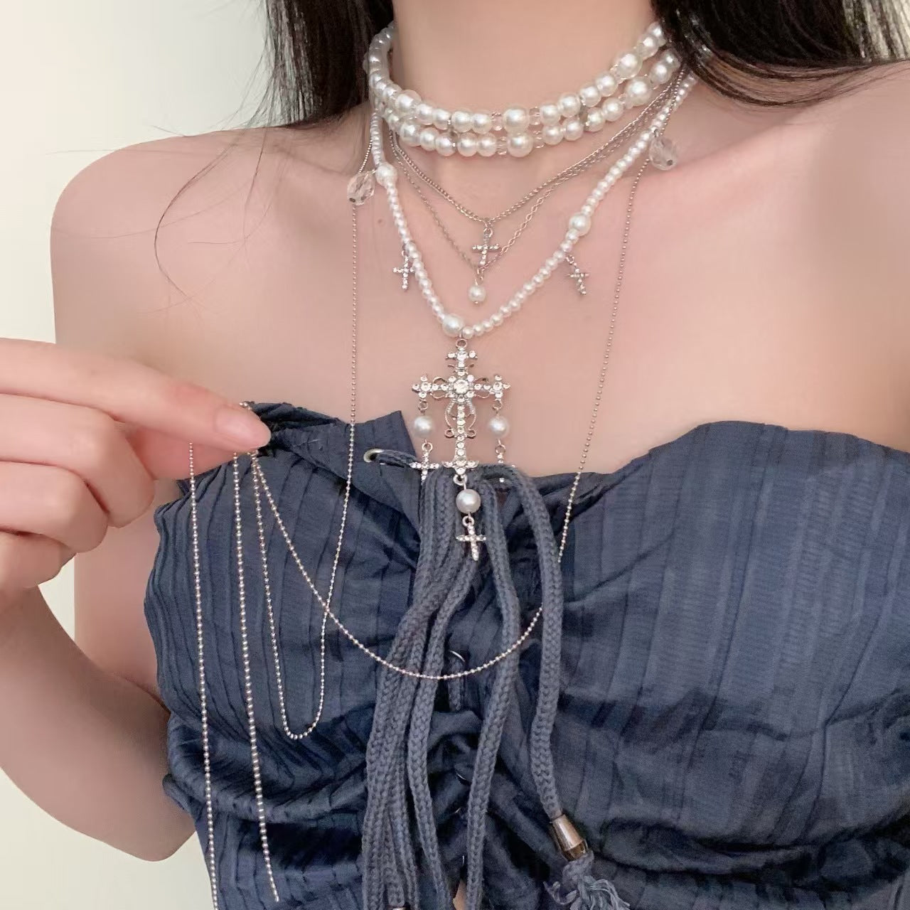 Popular cross stacked pearl beaded necklace female niche high sense Spice girl collarbone chain jewelry