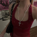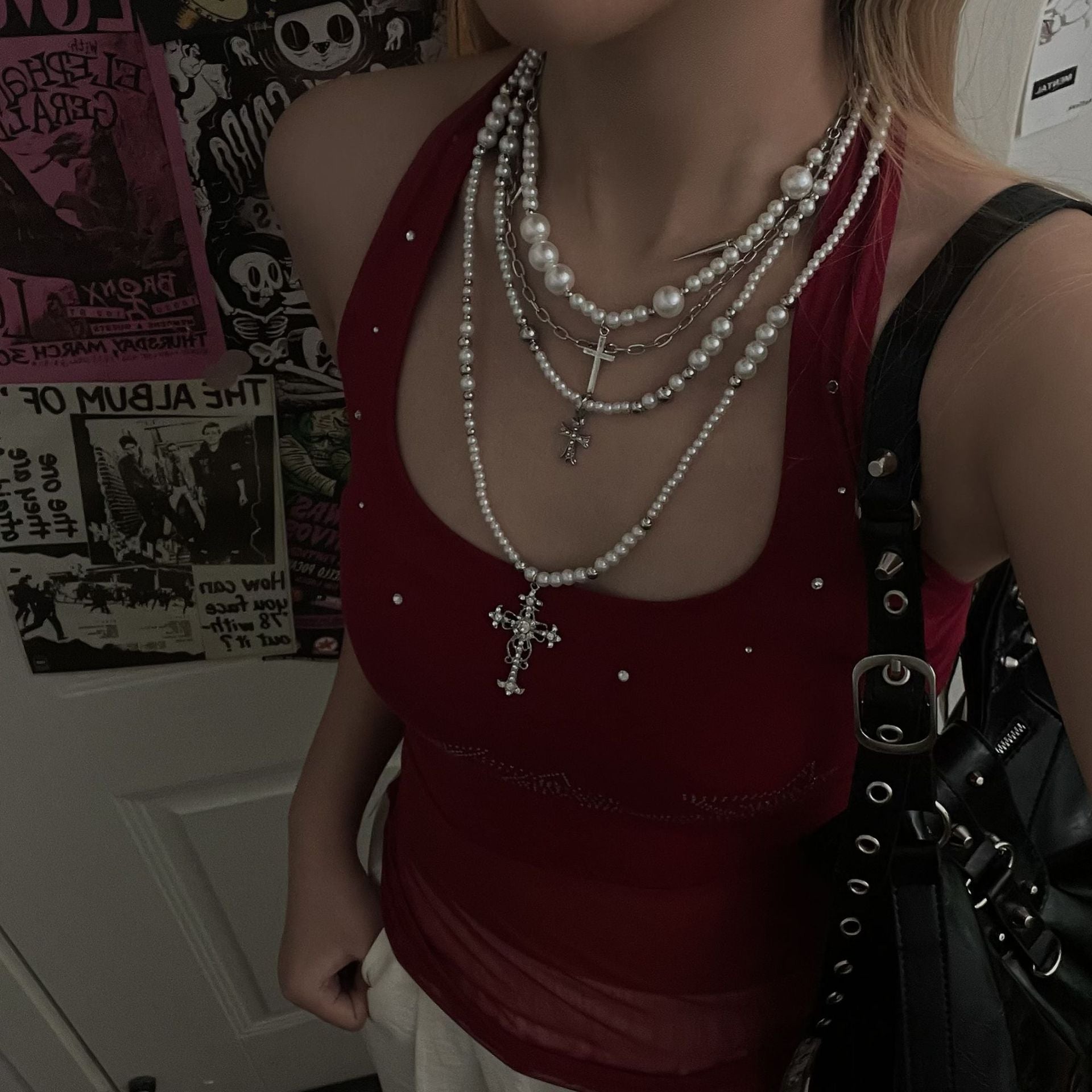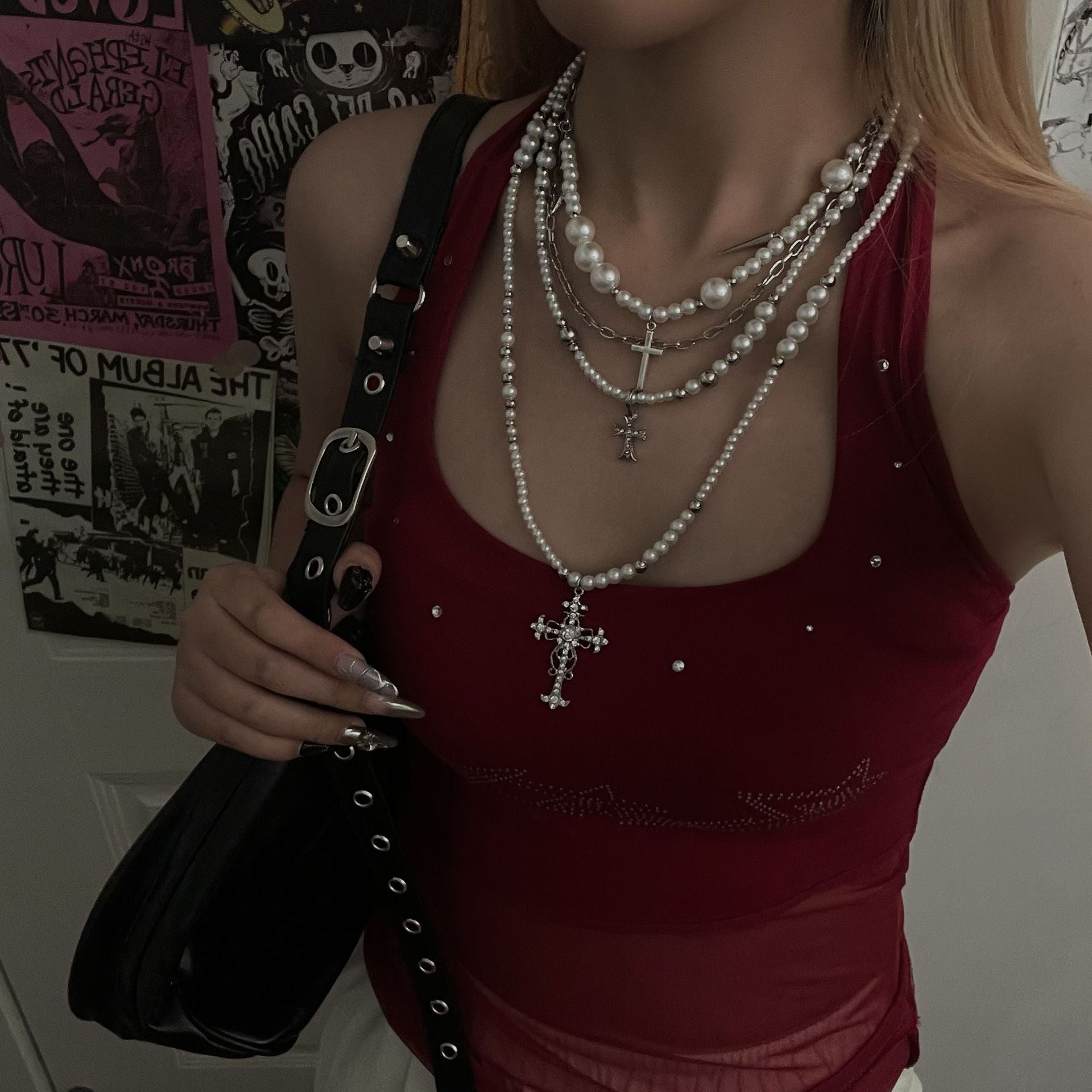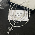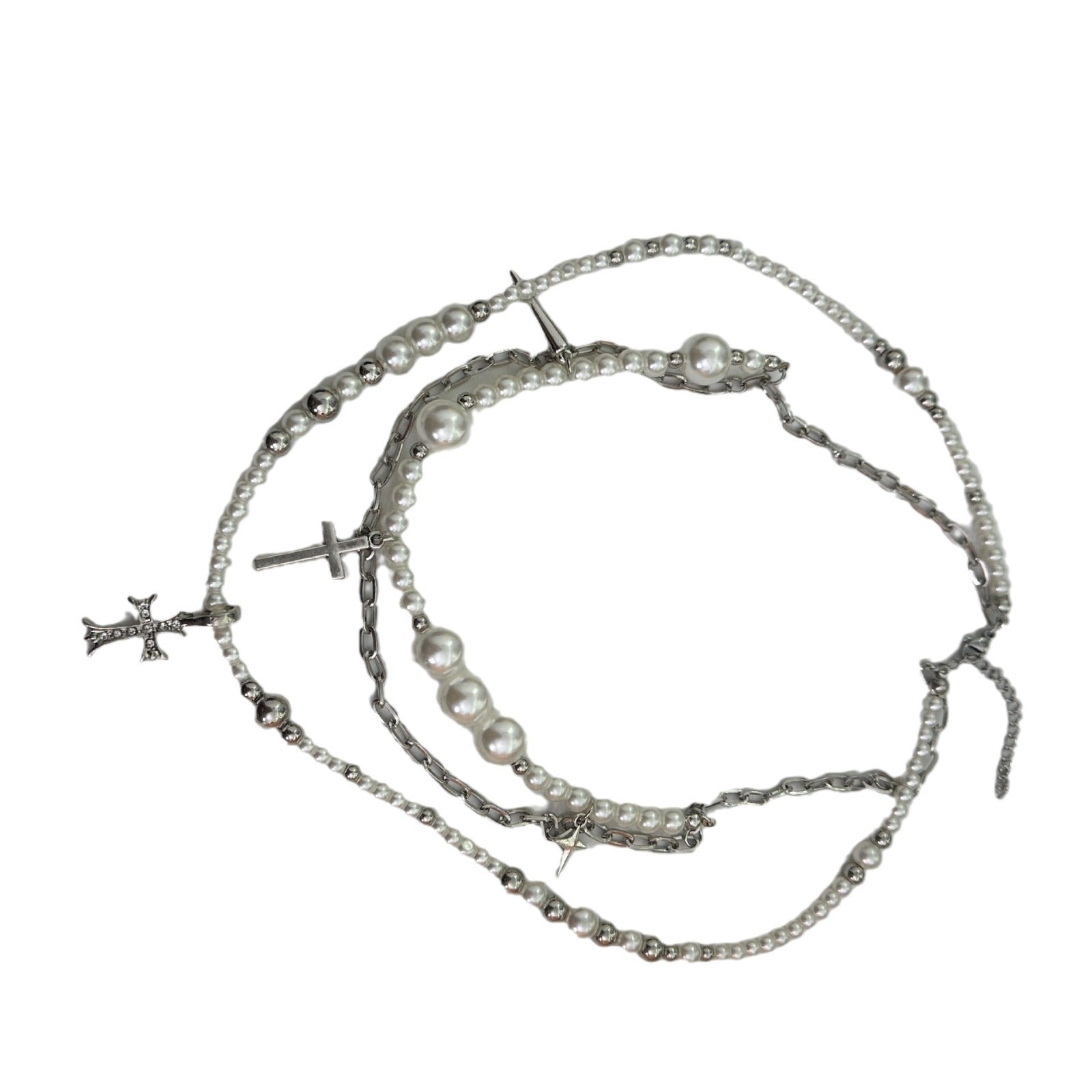 Popular cross stacked pearl beaded necklace female niche high sense Spice girl collarbone chain jewelry