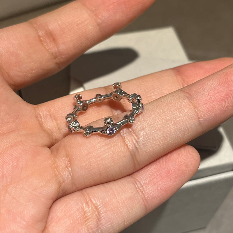 High Edition: Queen Mother Vivien 925 Sterling Silver Spaced Purple Round Diamond Crown Saturn Ring Premium Ring