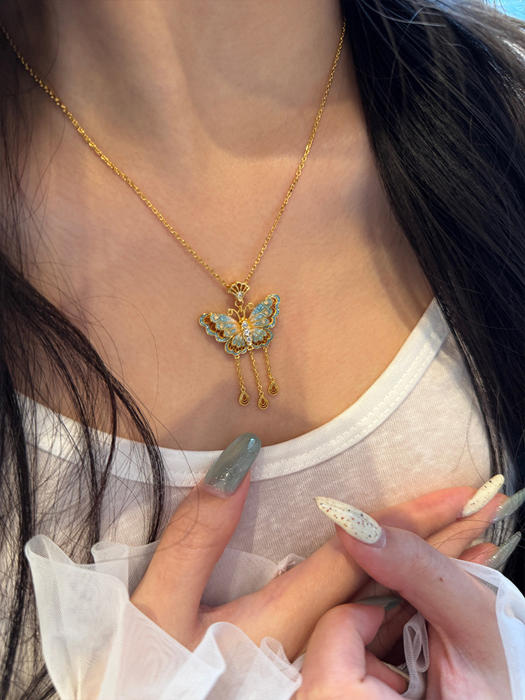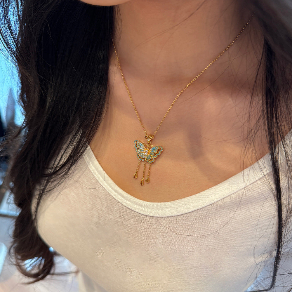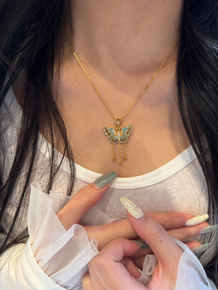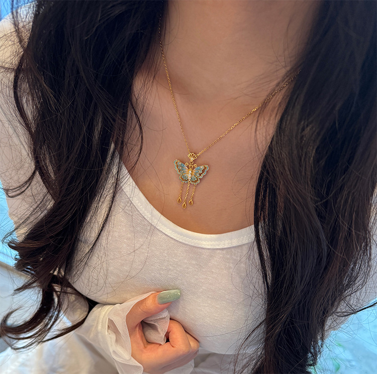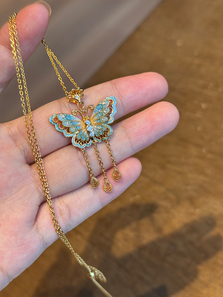 Live broadcast explosive new Chinese ancient method burning blue butterfly tassel necklace three-dimensional dream butterfly pendant gold replacement