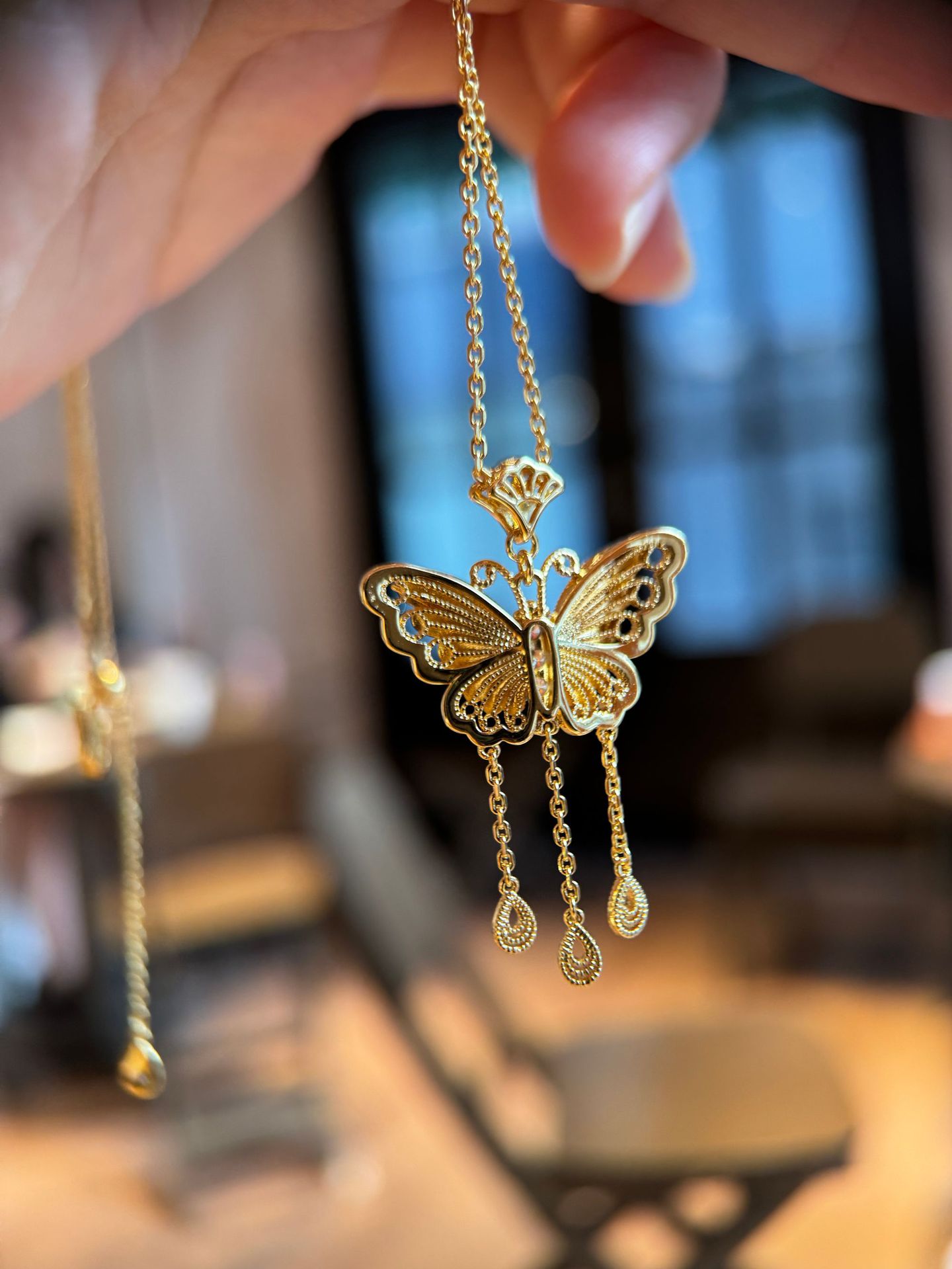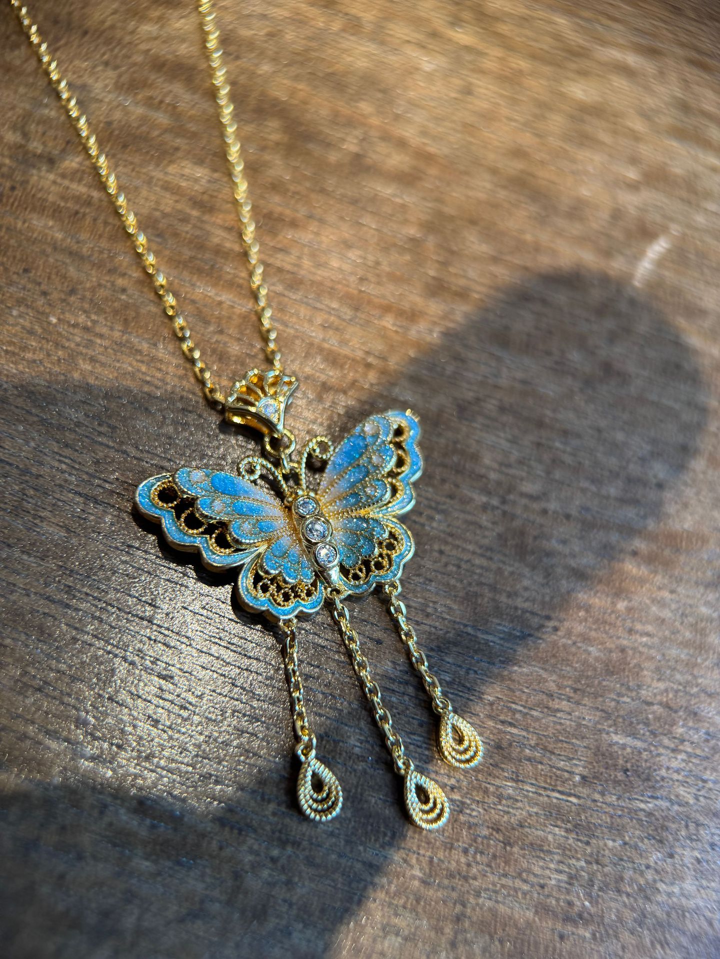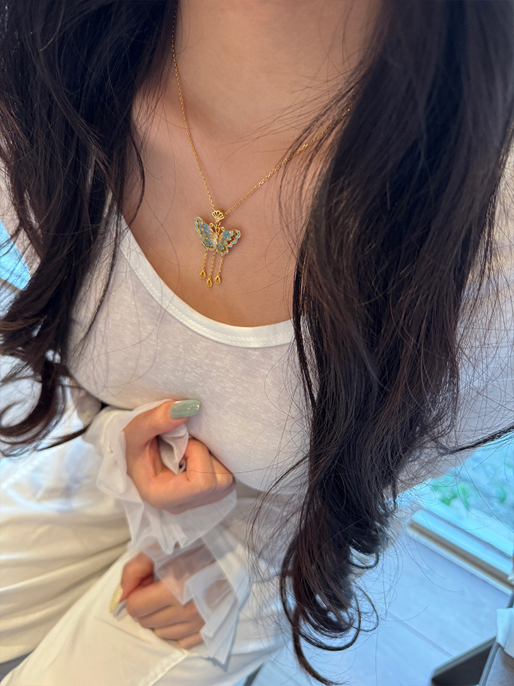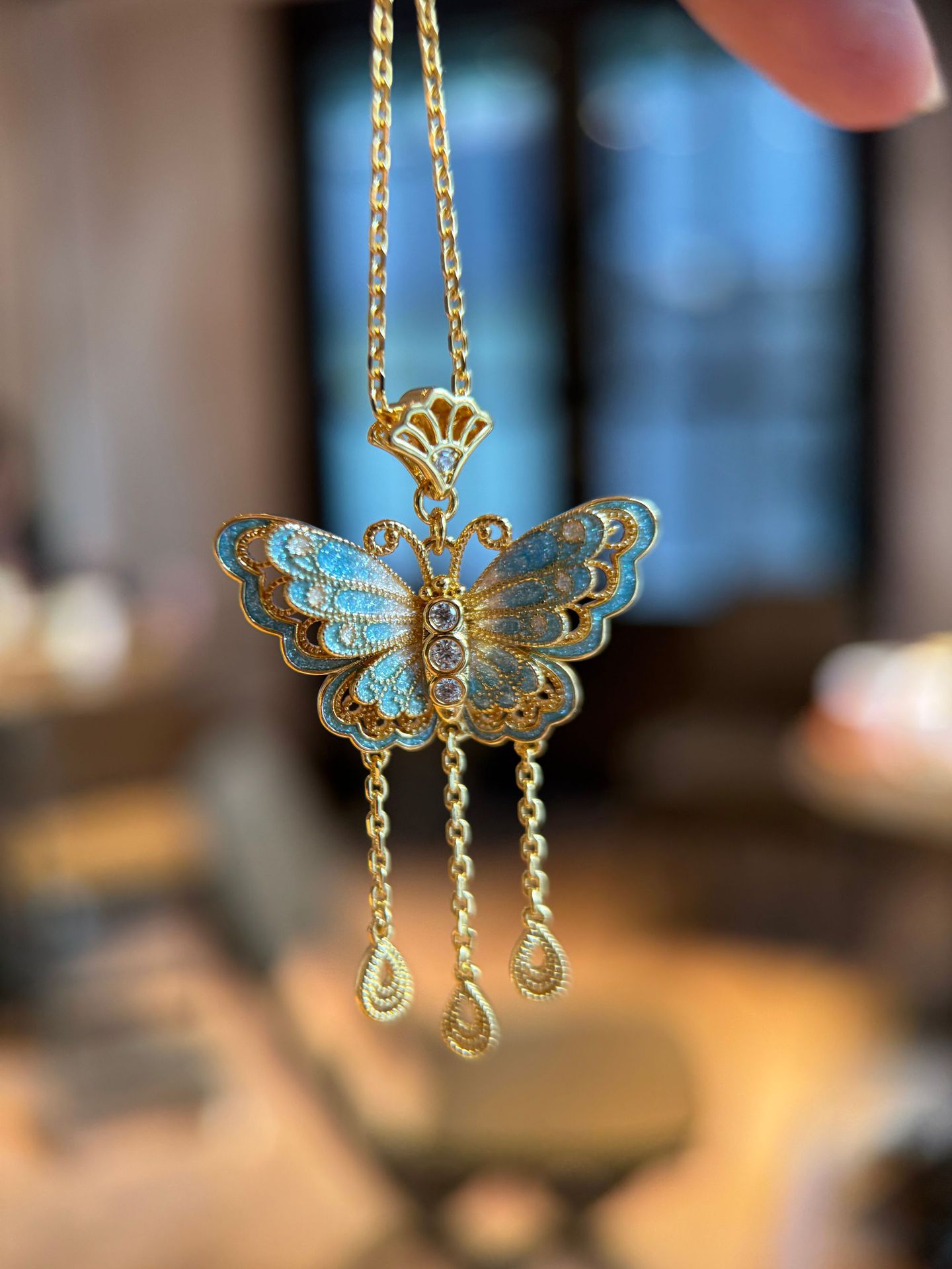 Live broadcast explosive new Chinese ancient method burning blue butterfly tassel necklace three-dimensional dream butterfly pendant gold replacement