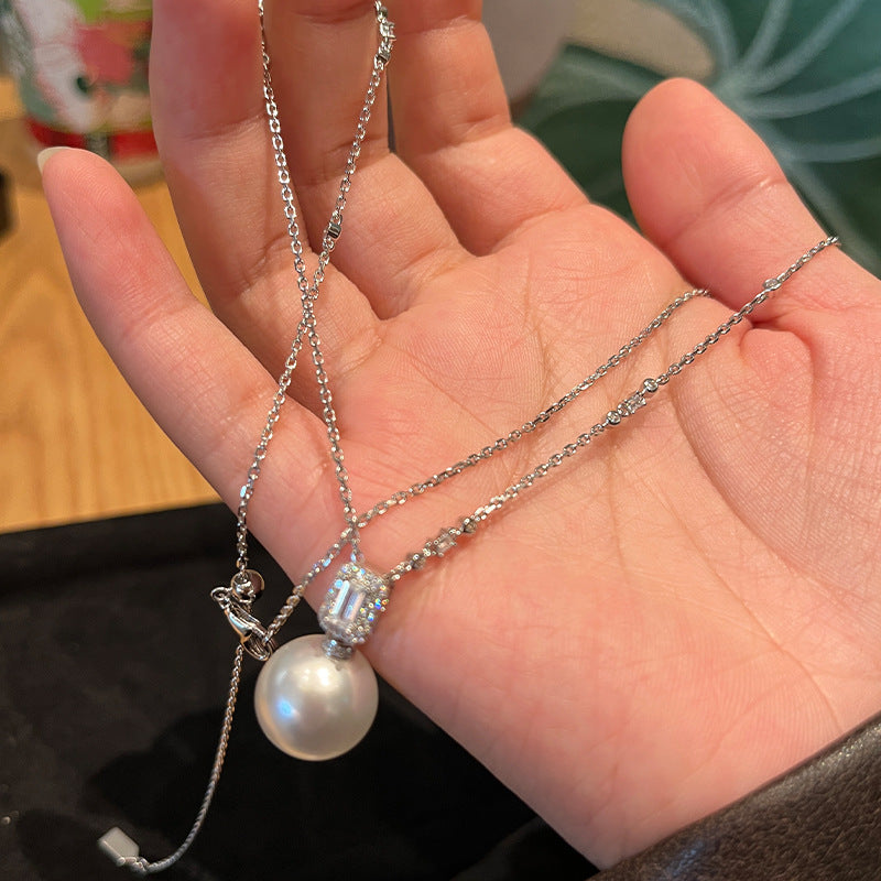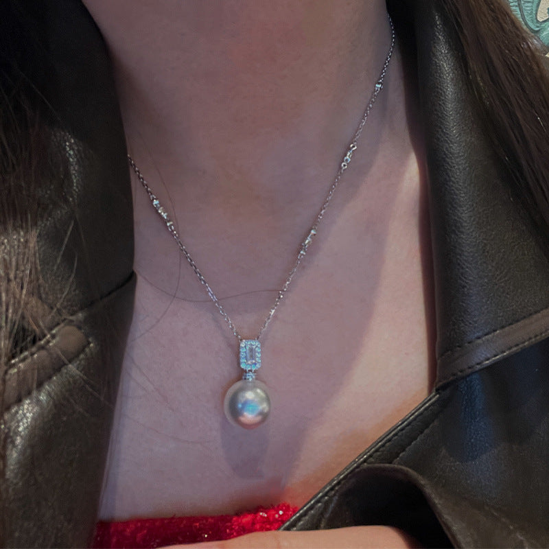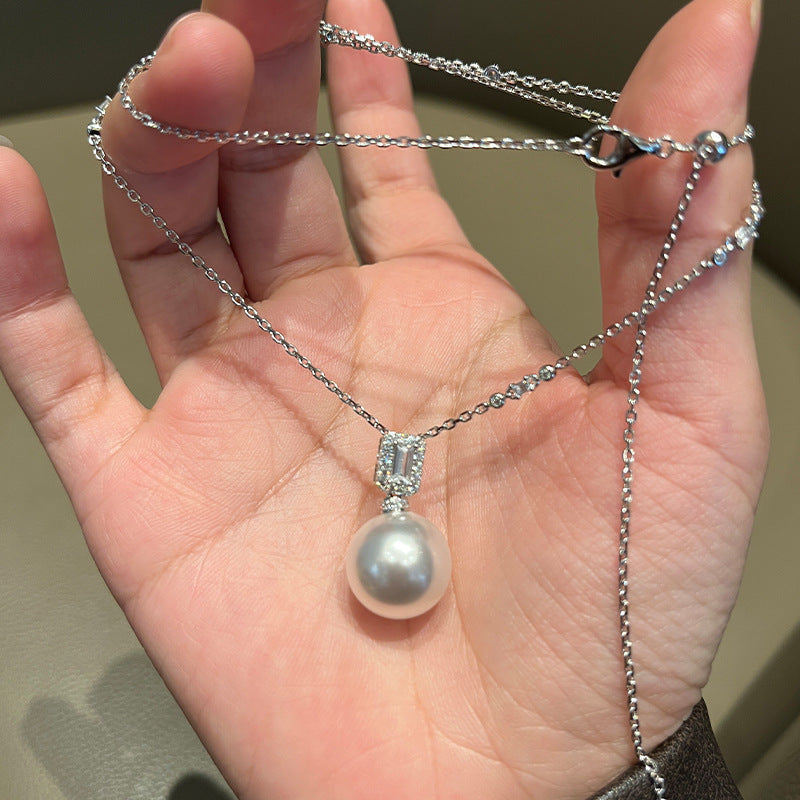 Live broadcast hit sterling silver 14mm Australian white flat single pearl necklace full diamond sugar cube rock candy heart pendant clavicle chain