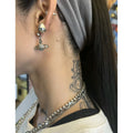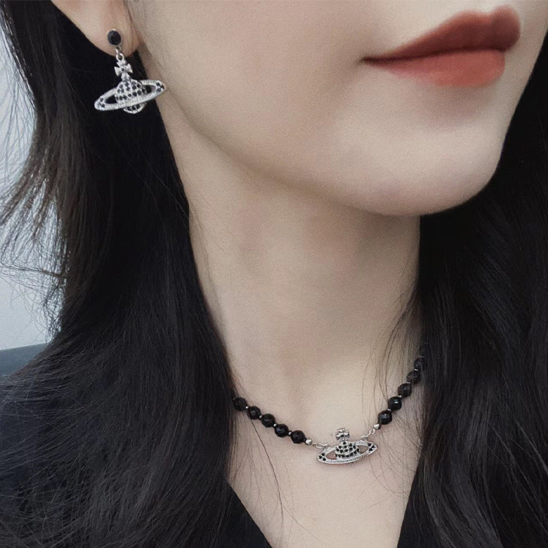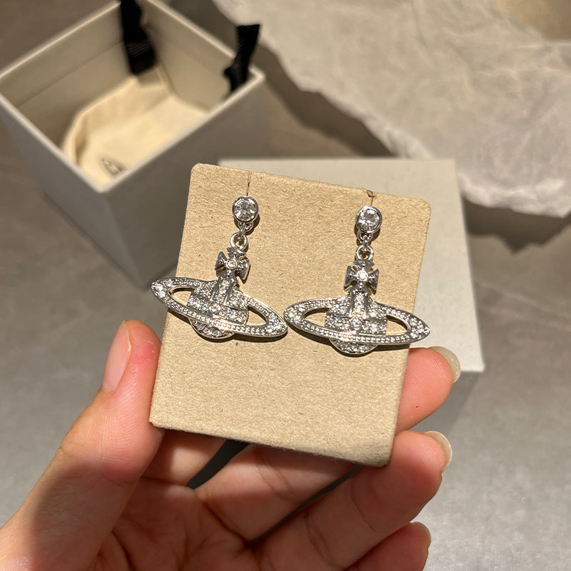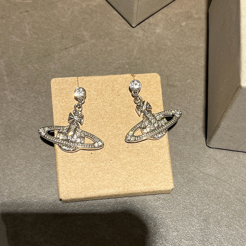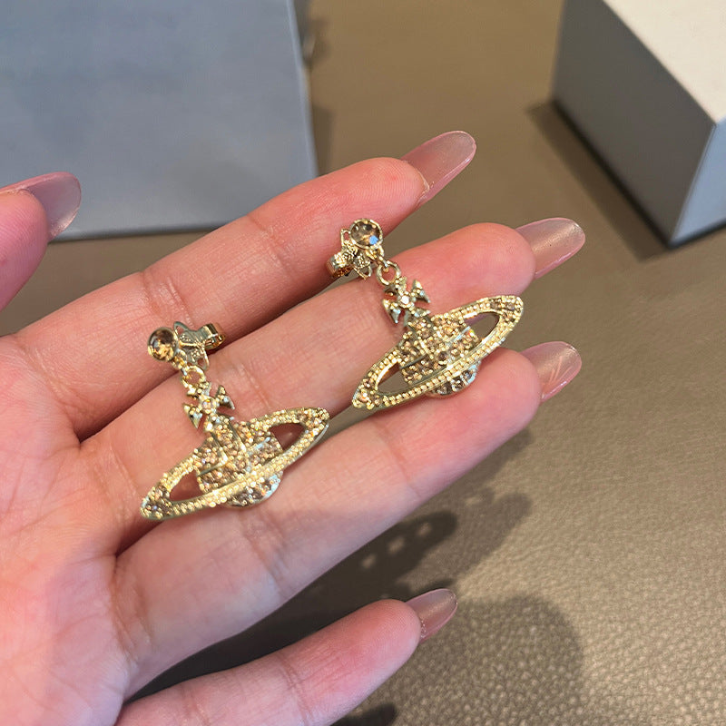 New Queen Mother Black Diamond White Diamond Saturn Earrings Full Diamond Seiko Flat Saturn Earrings Niche Design Sense
