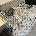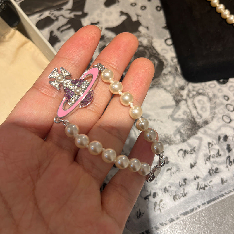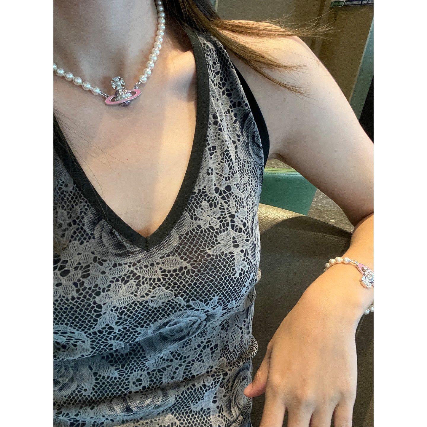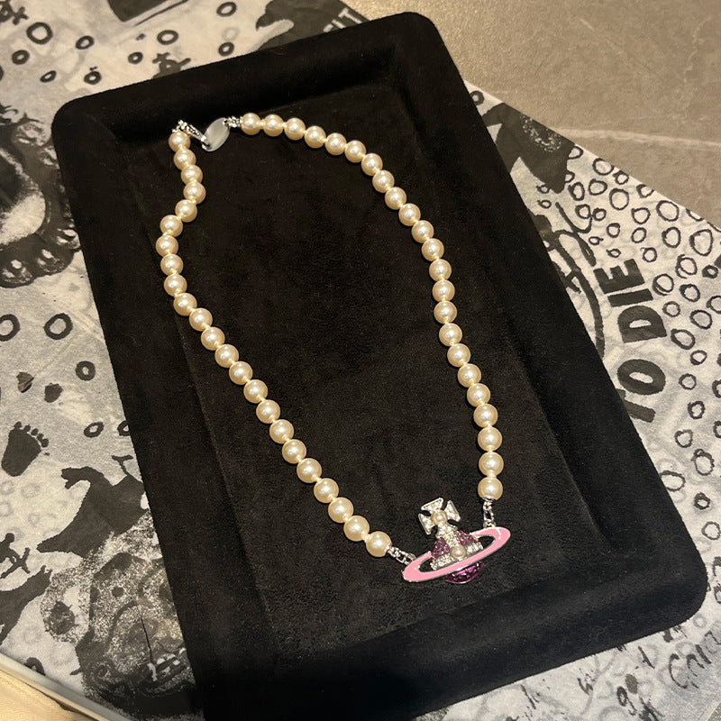 Pink enamel pearl Saturn necklace Queen Mother West pendant choker clavicle chain thousand seals hot girl sweet cool necklace
