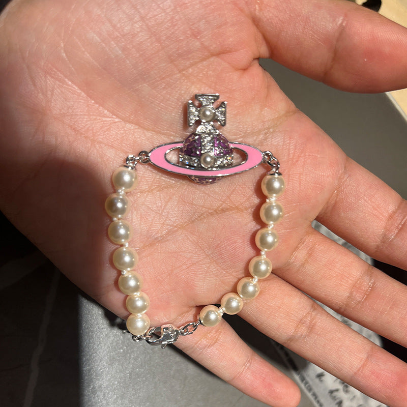 Pink enamel pearl Saturn necklace Queen Mother West pendant choker clavicle chain thousand seals hot girl sweet cool necklace