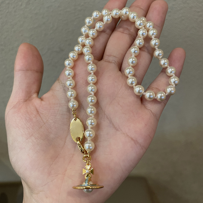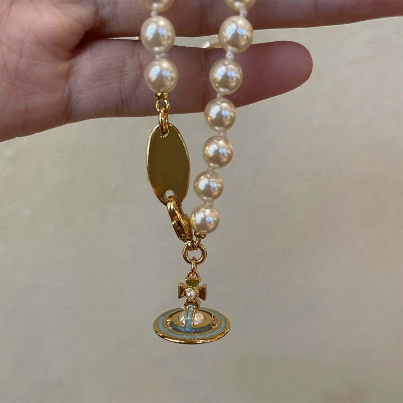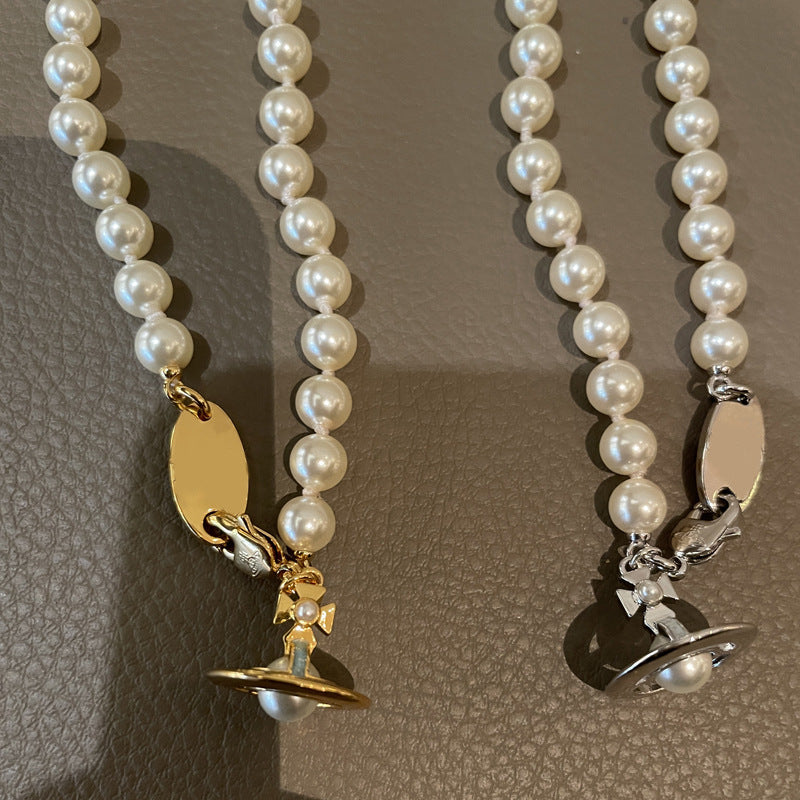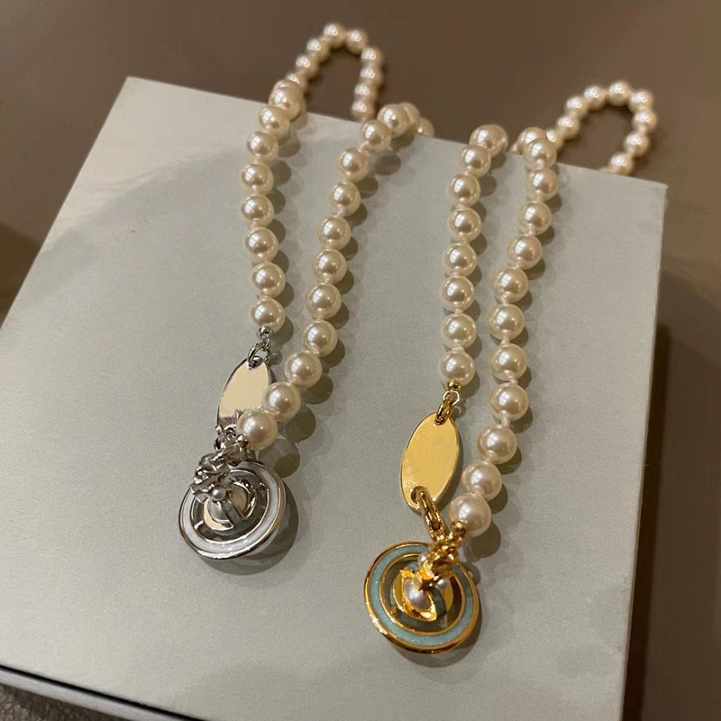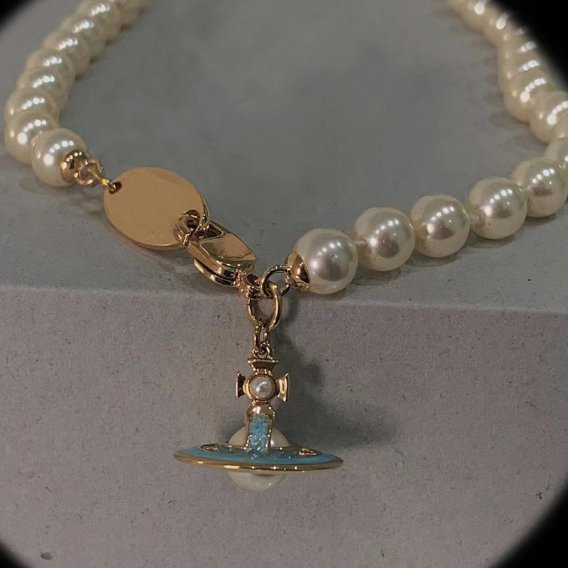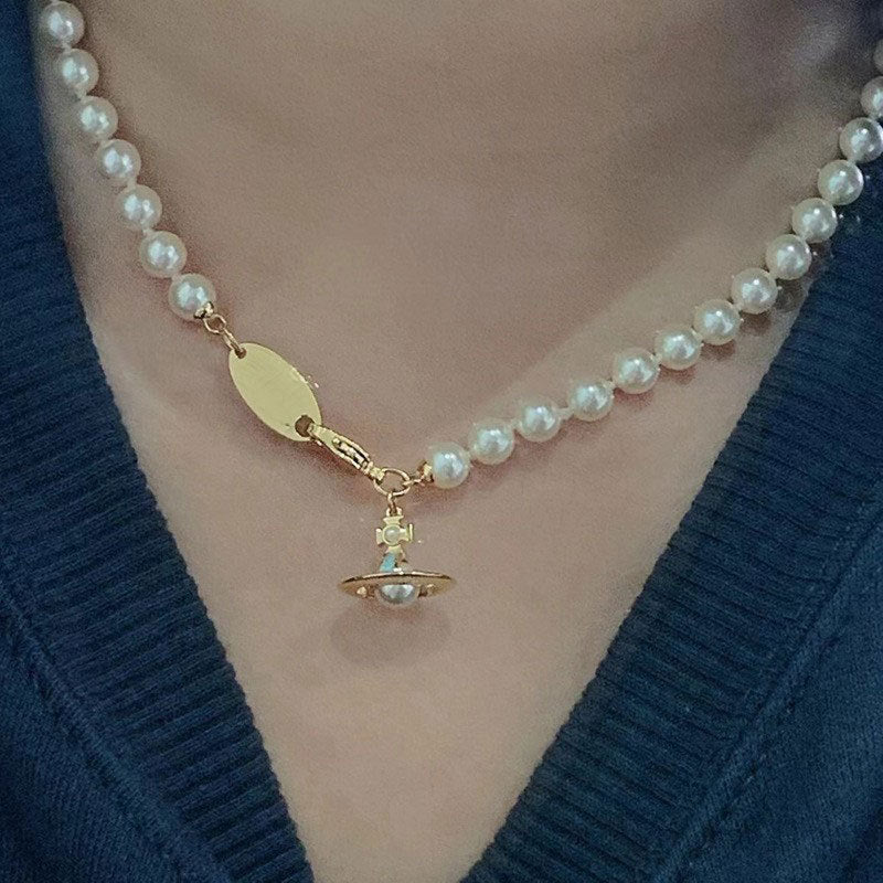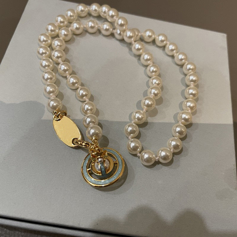 Queen Mother of the West gilt blue three-dimensional Saturn pearl necklace white enamel orb saucer pearl necklace