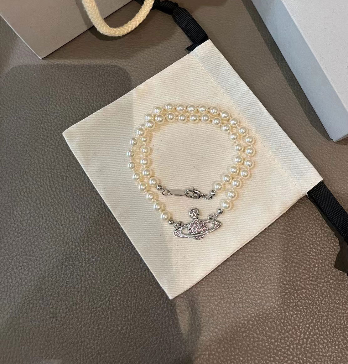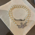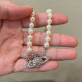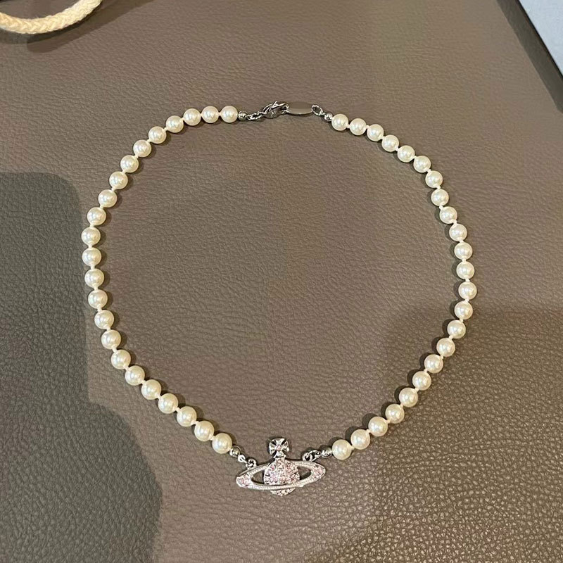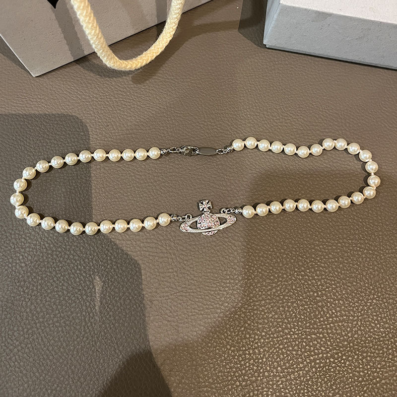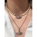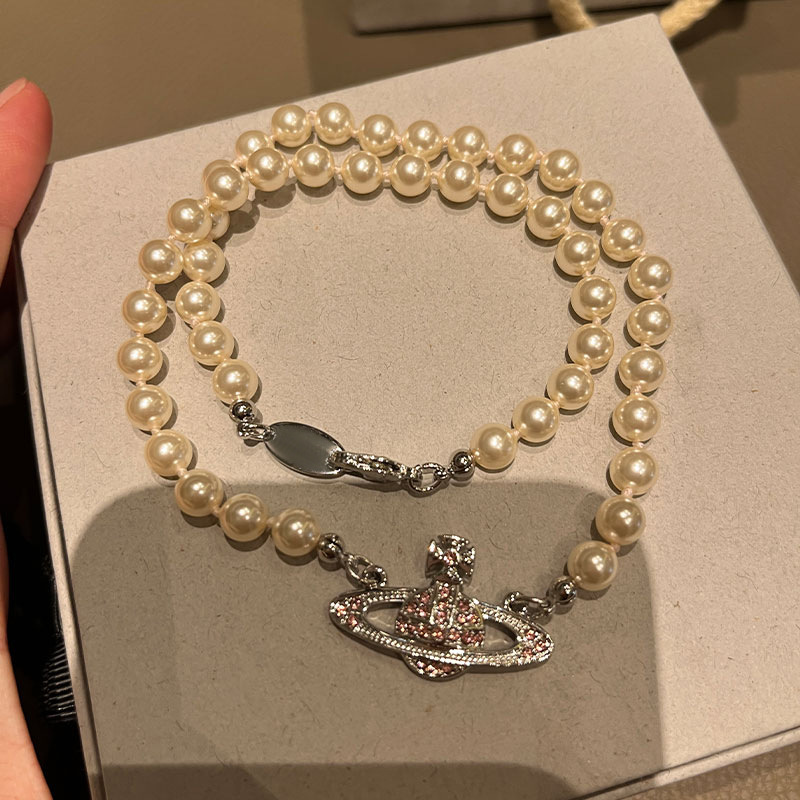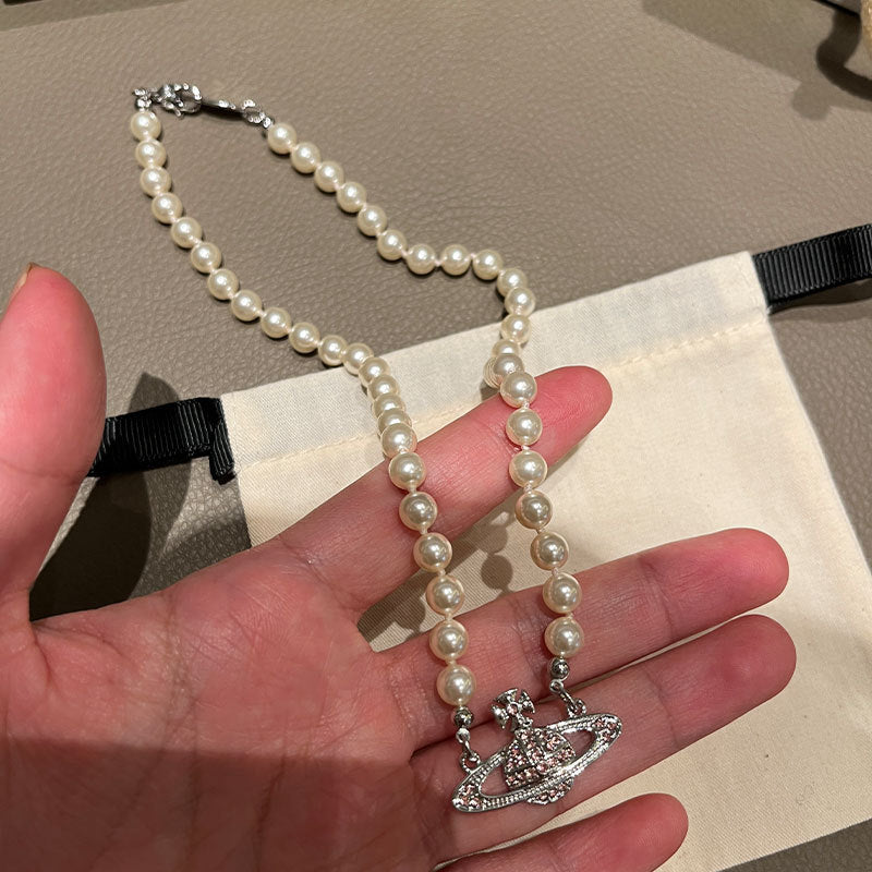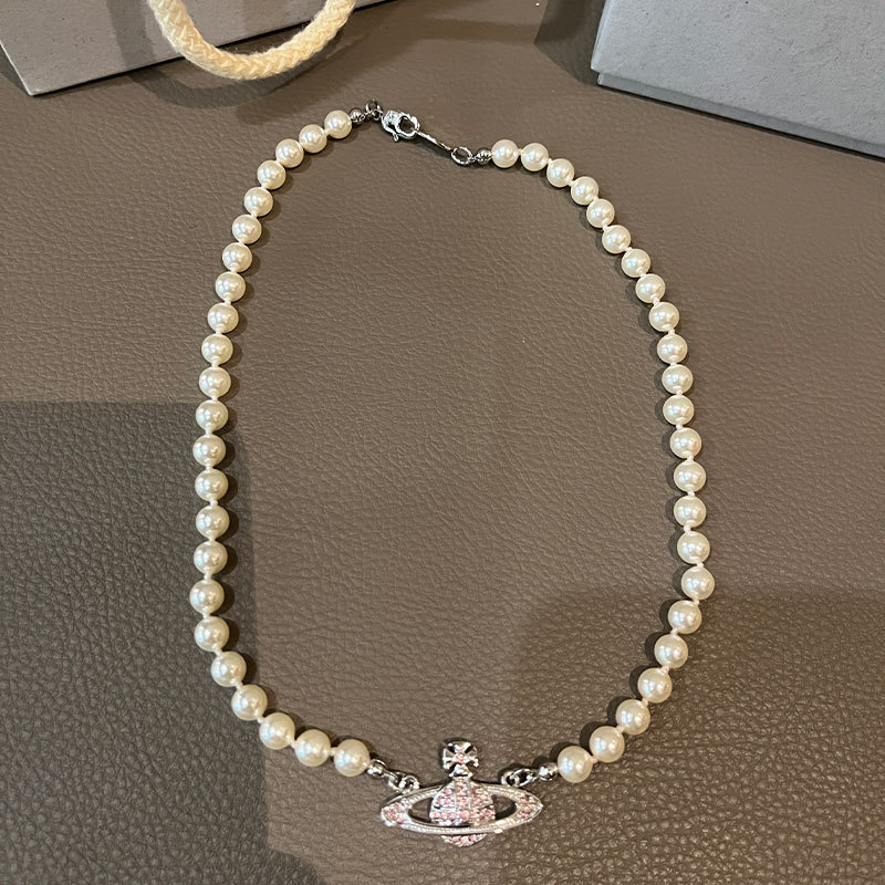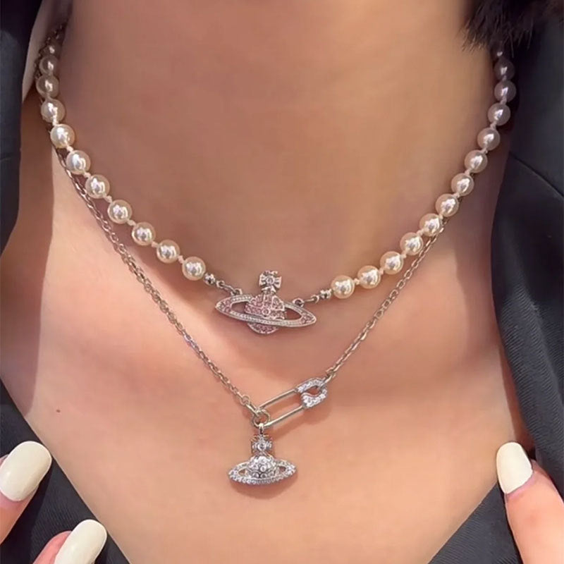 Queen Mother West Pink Diamond Saturn Pearl Necklace Pink Planet Pendant Women's Clavicle Chain Can Be Stacked and Versatile