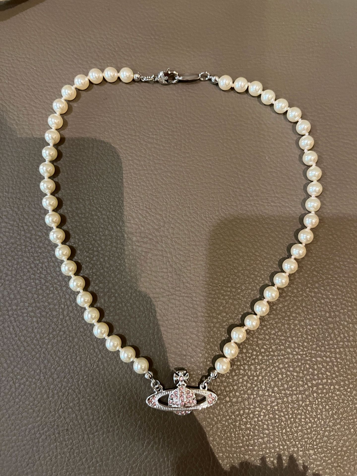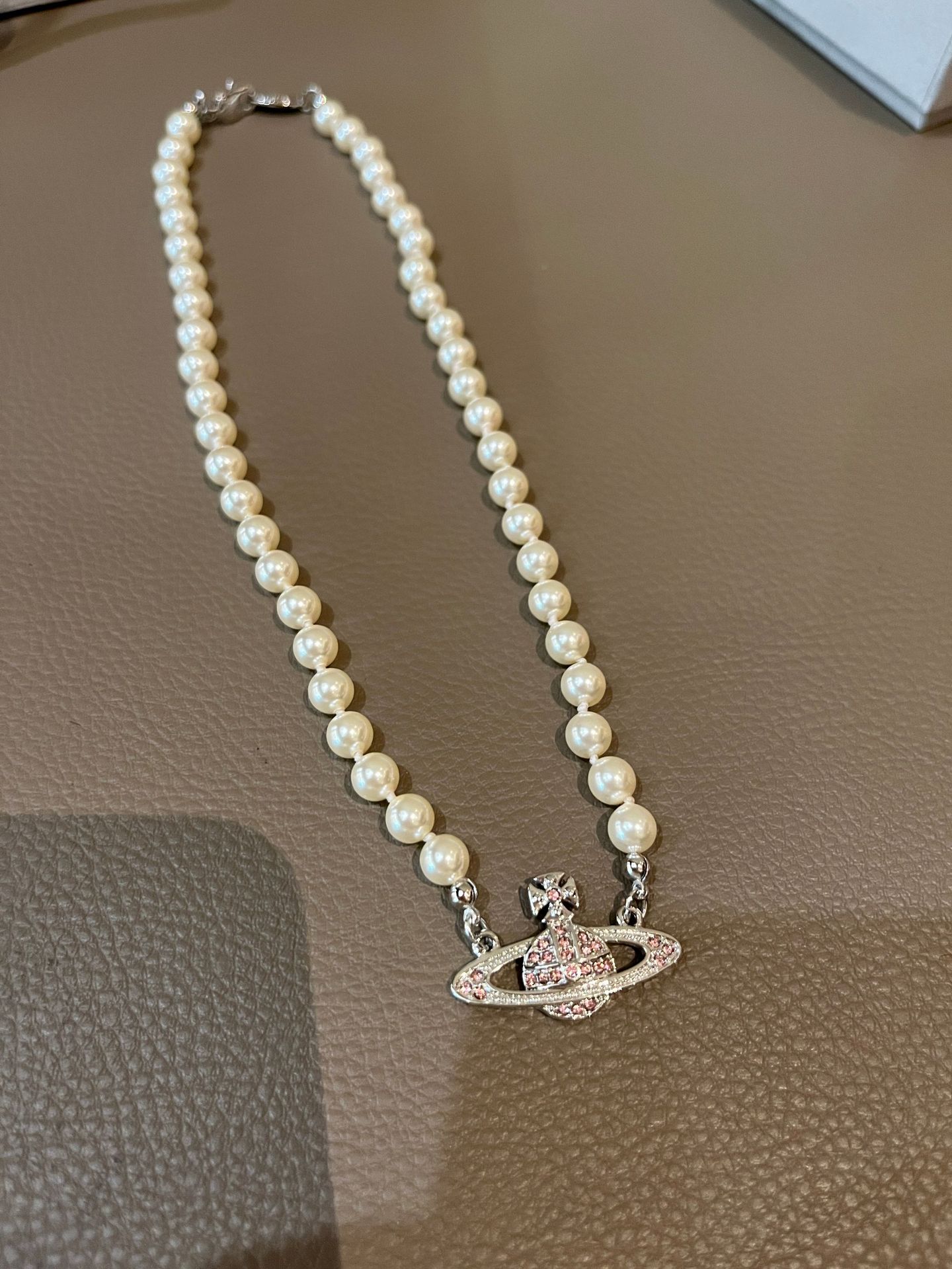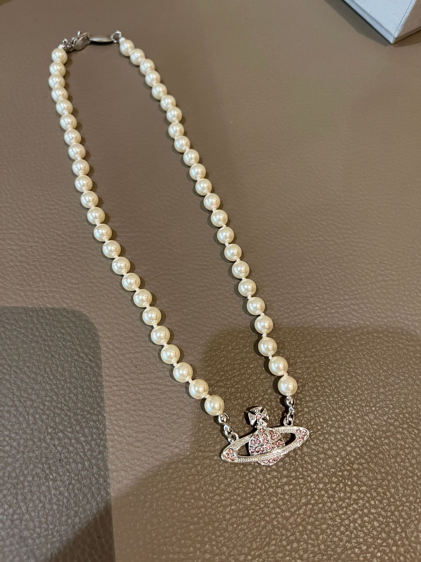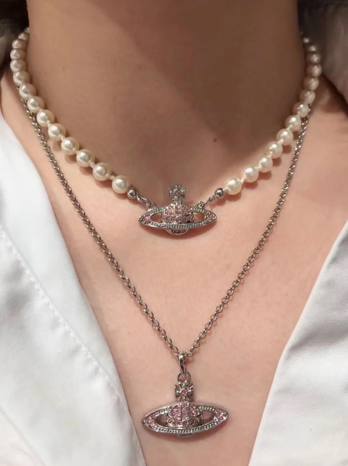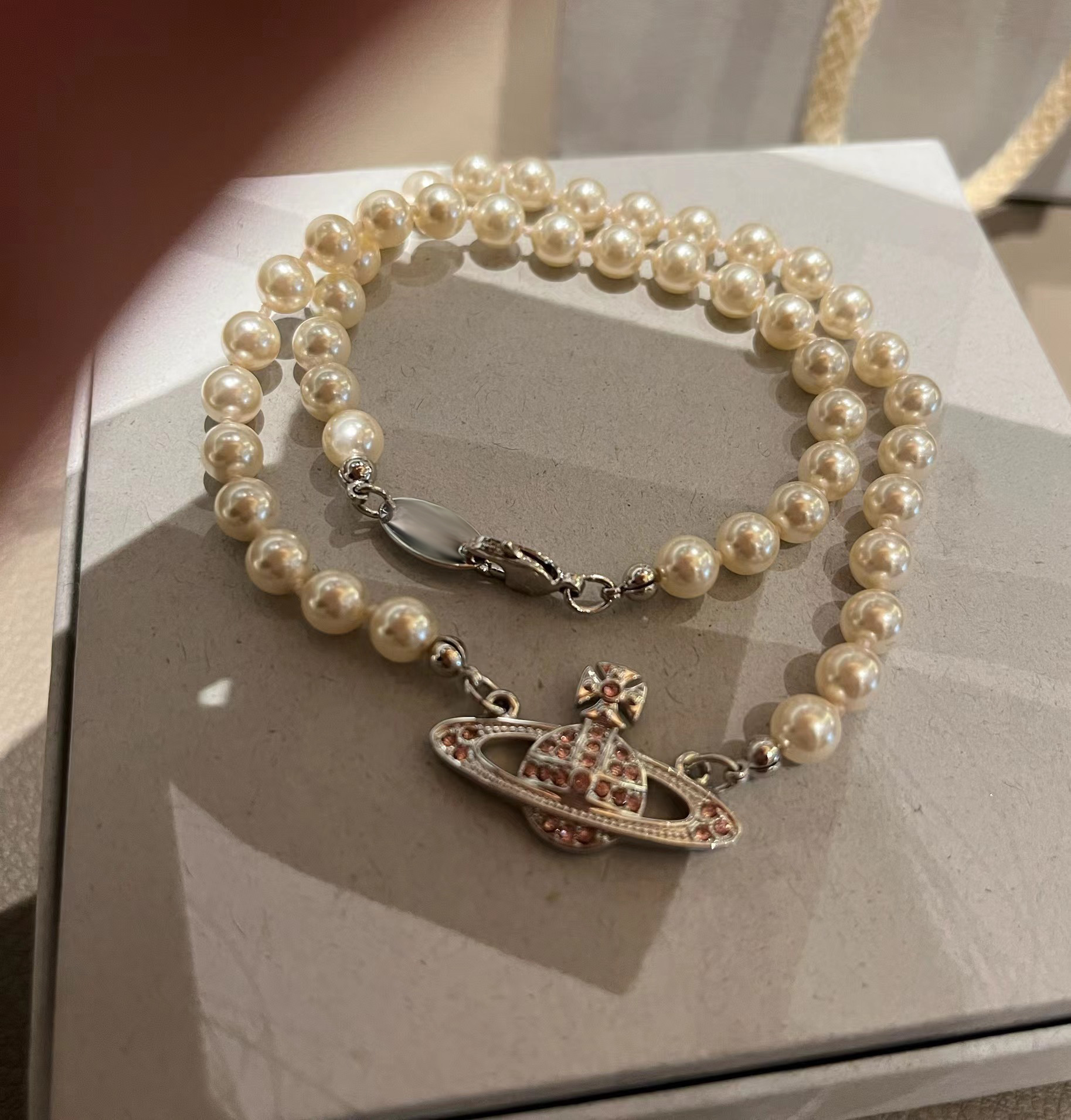 Queen Mother West Pink Diamond Saturn Pearl Necklace Pink Planet Pendant Women's Clavicle Chain Can Be Stacked and Versatile