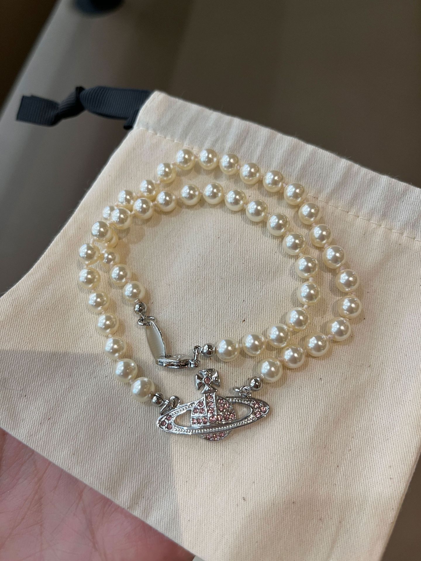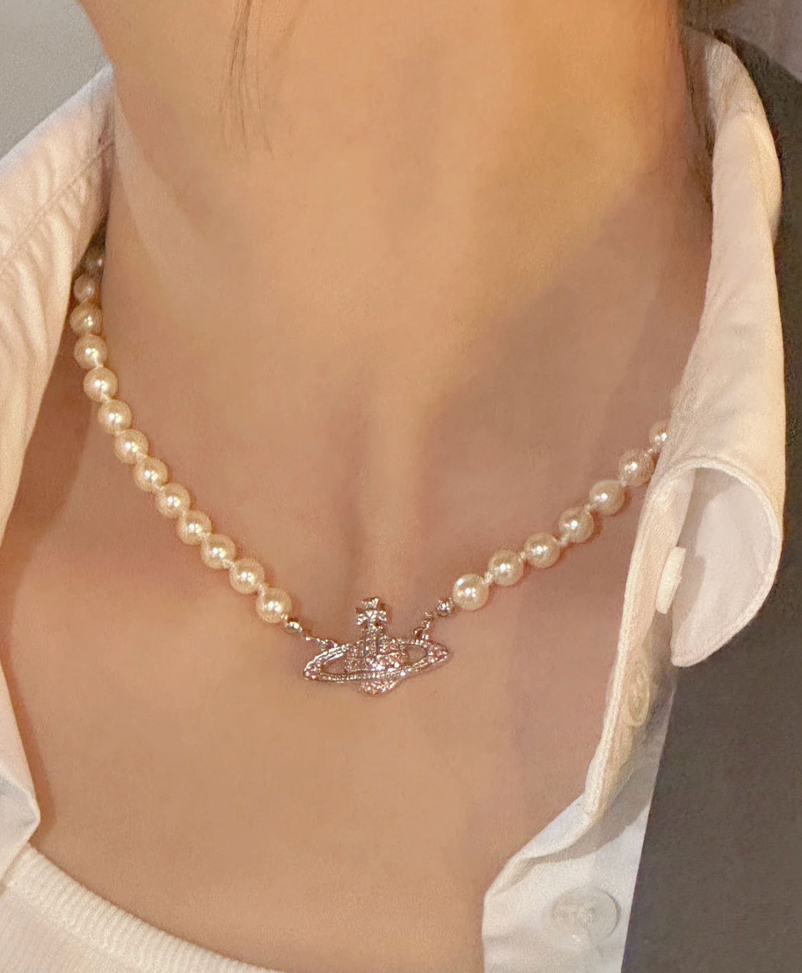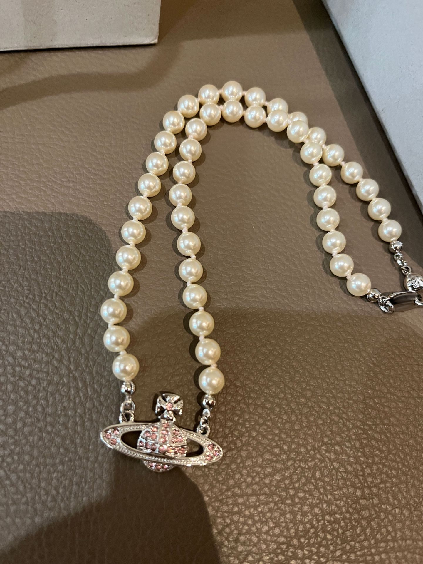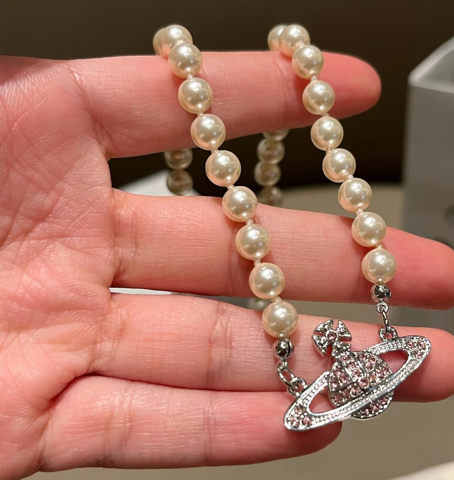 Queen Mother West Pink Diamond Saturn Pearl Necklace Pink Planet Pendant Women's Clavicle Chain Can Be Stacked and Versatile