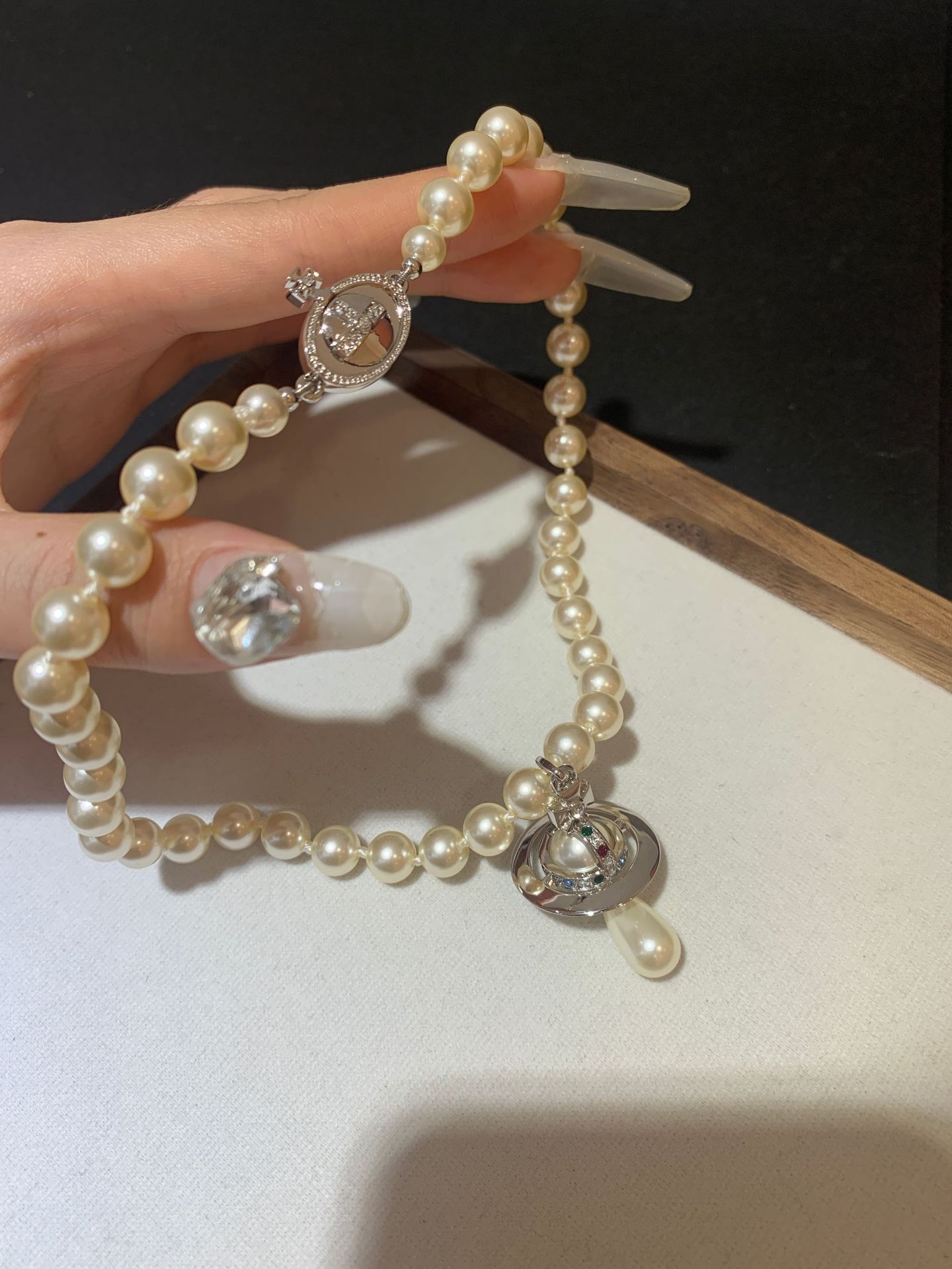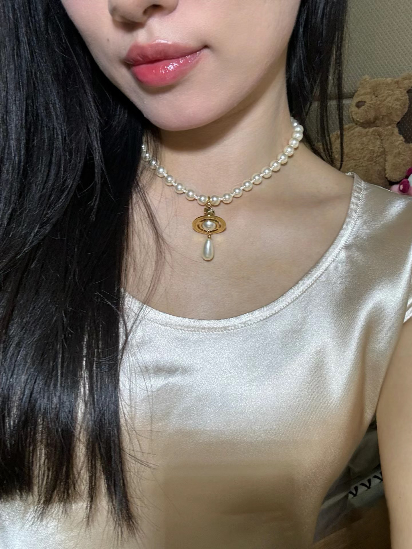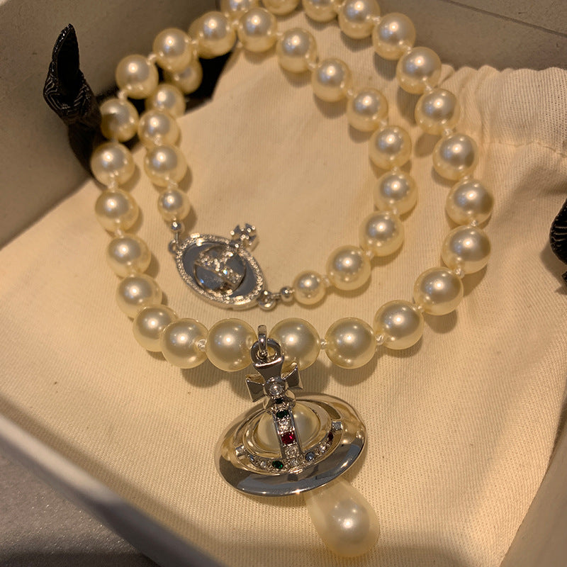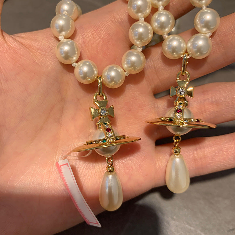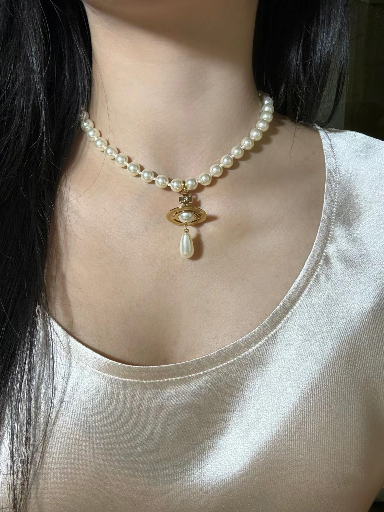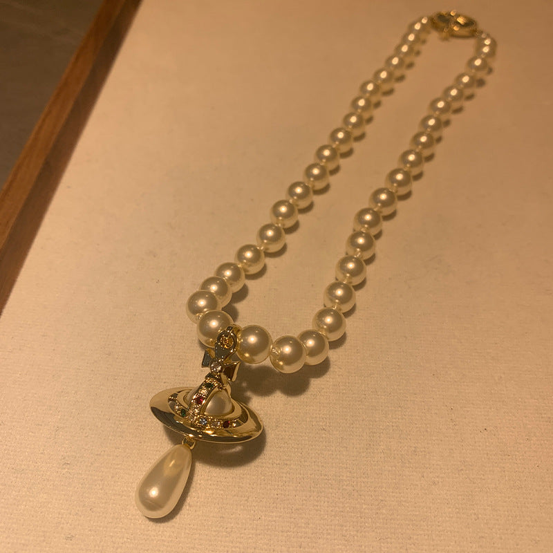 Queen Mother West Water Drop Pearl Pendant Three-dimensional Saturn UFO Pearl Necklace Choker Vintage Female Clavicle Chain