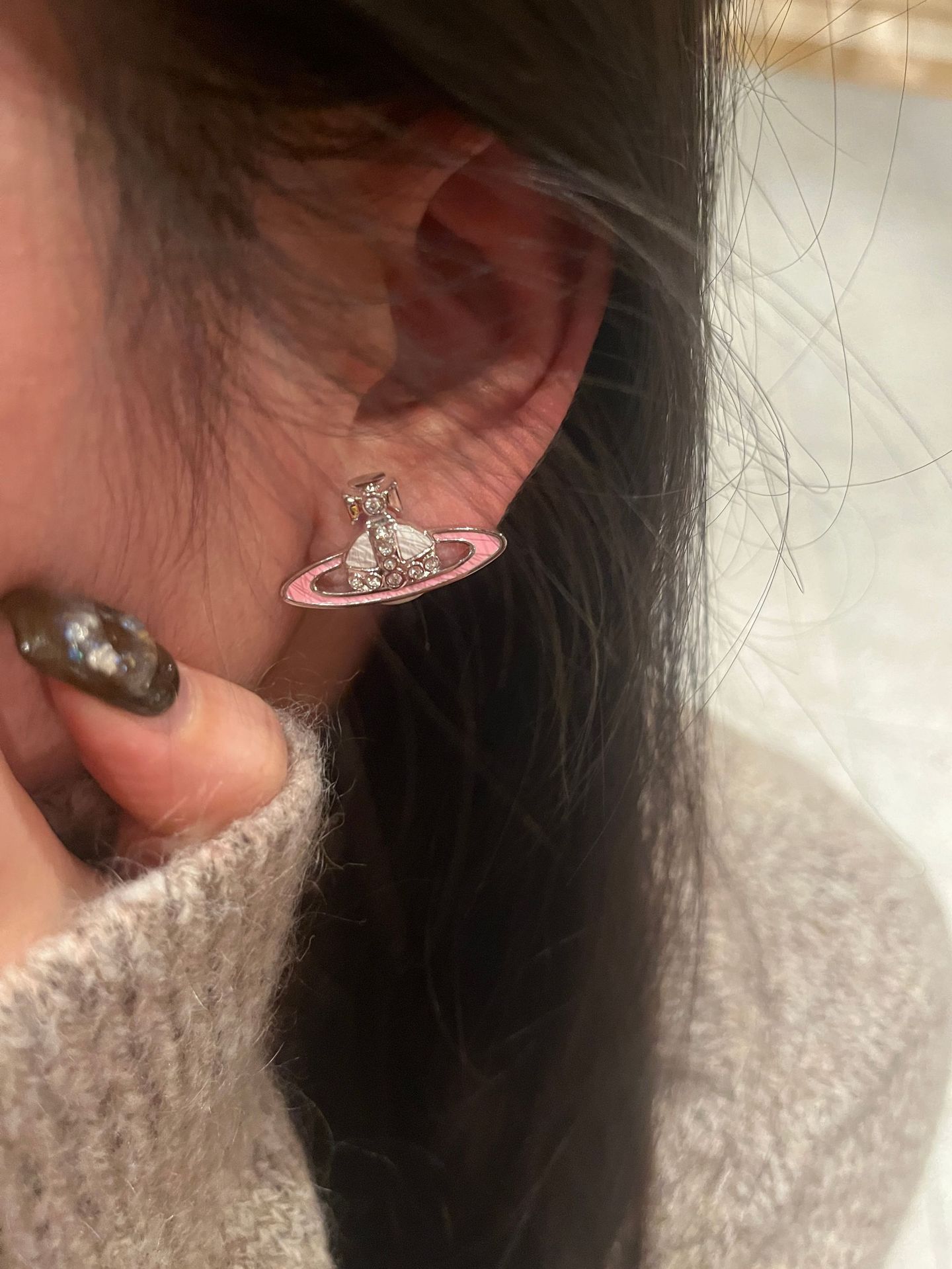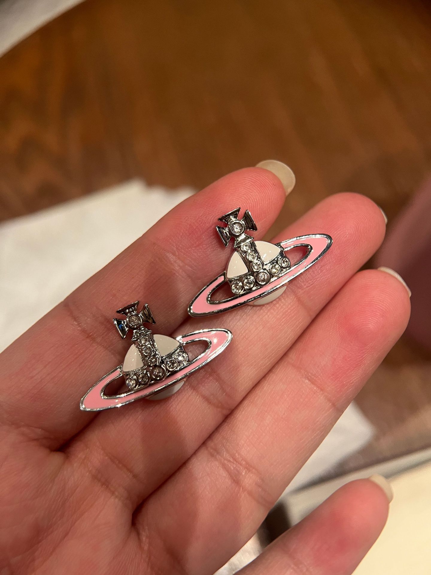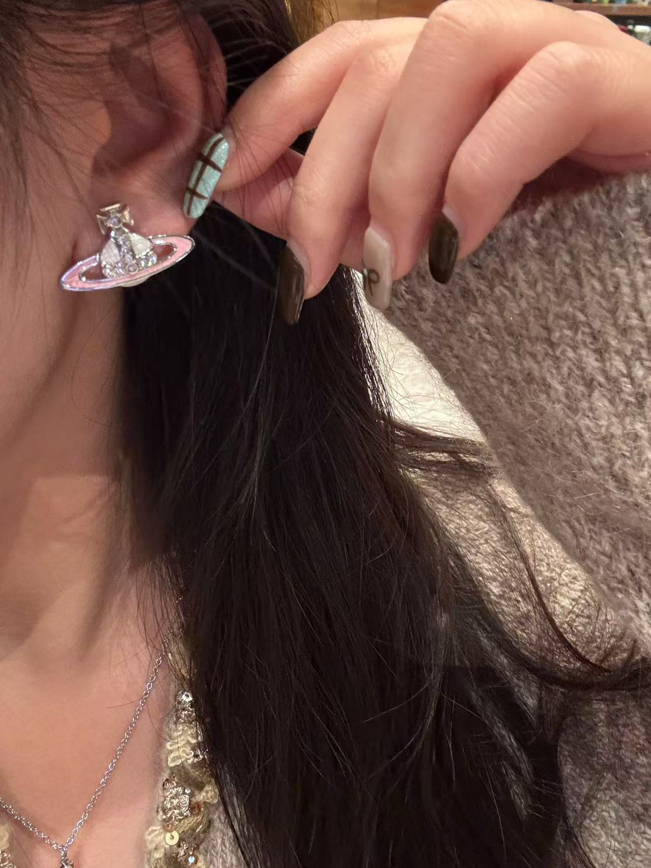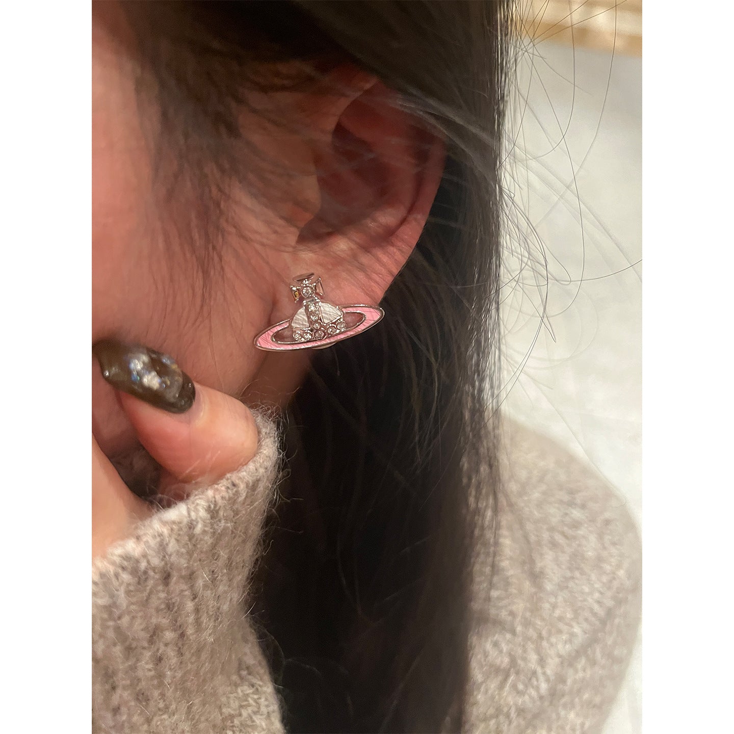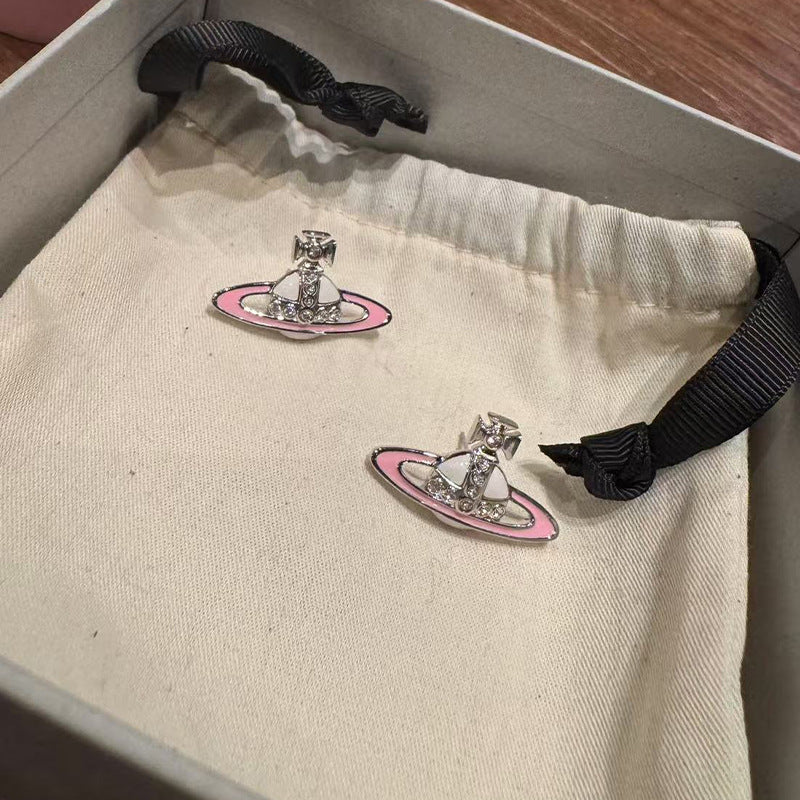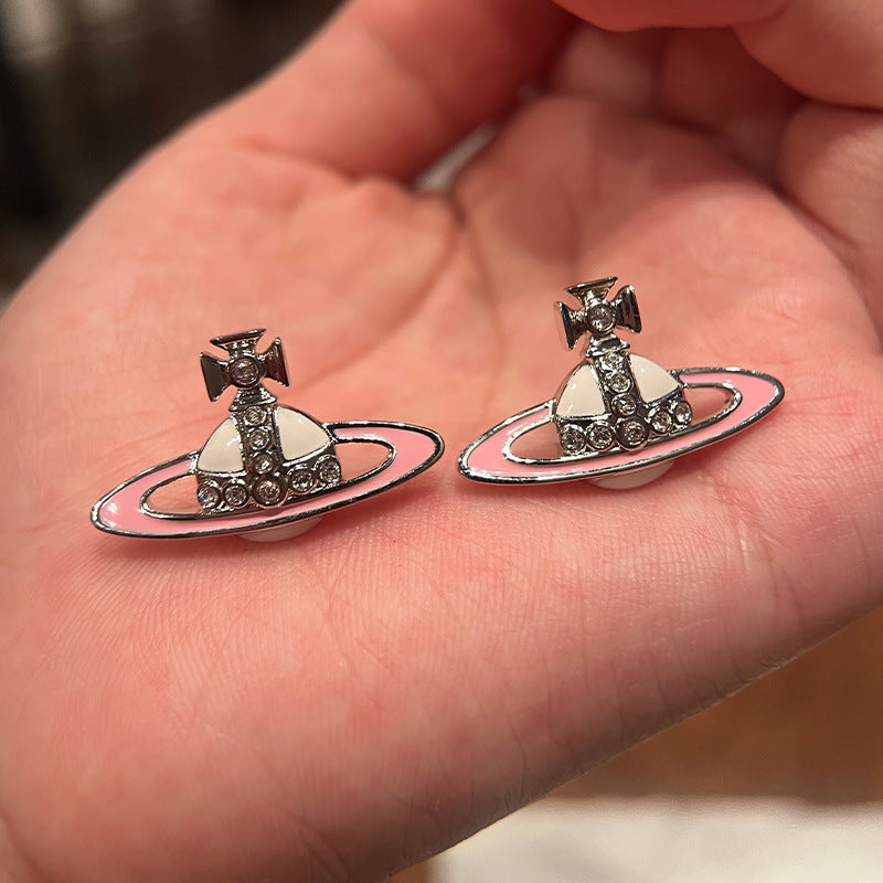 Queen West pink and white enamel Saturn stud earrings Seiko two-tone lacquer diamond orb earrings versatile everyday model