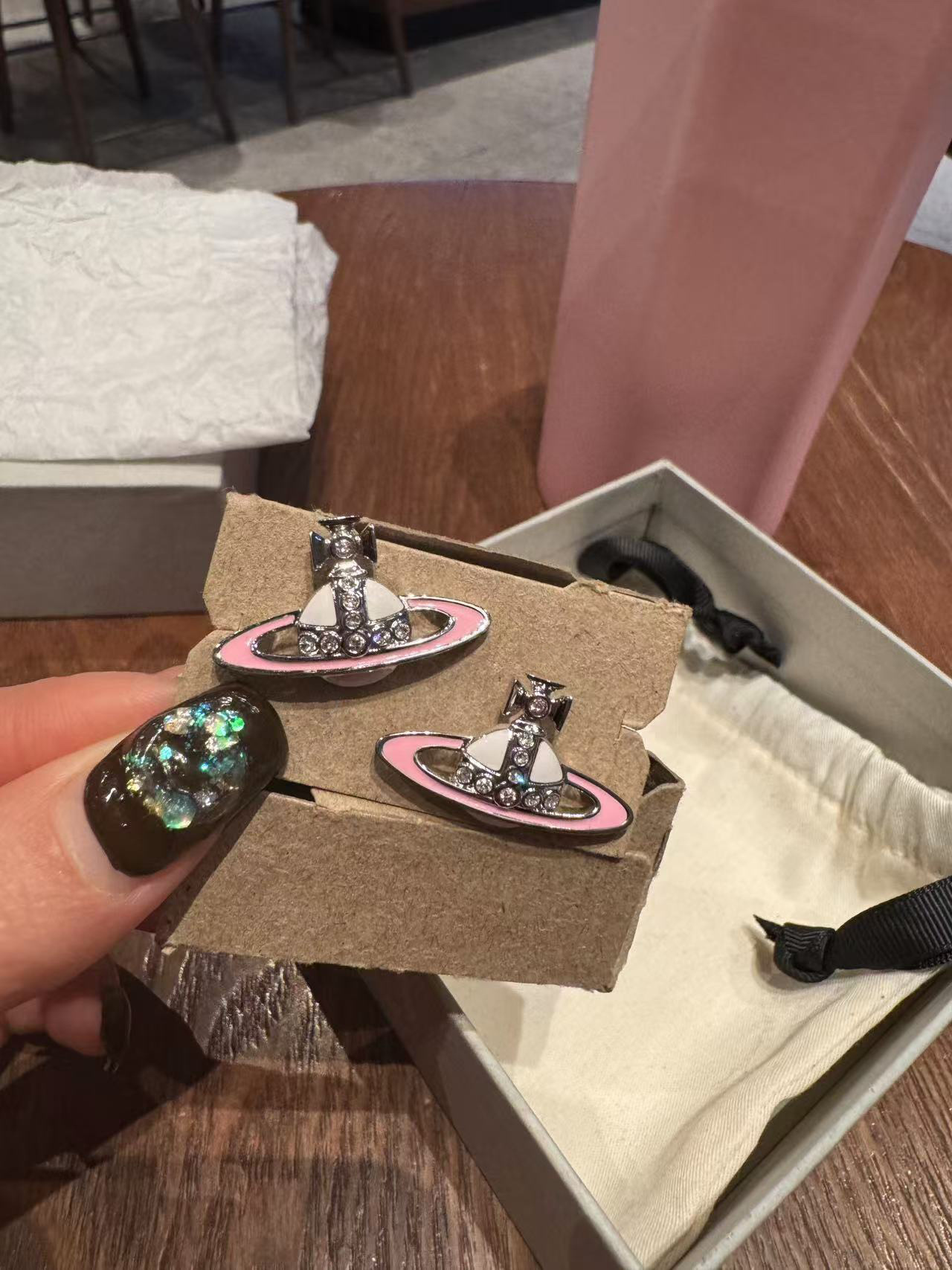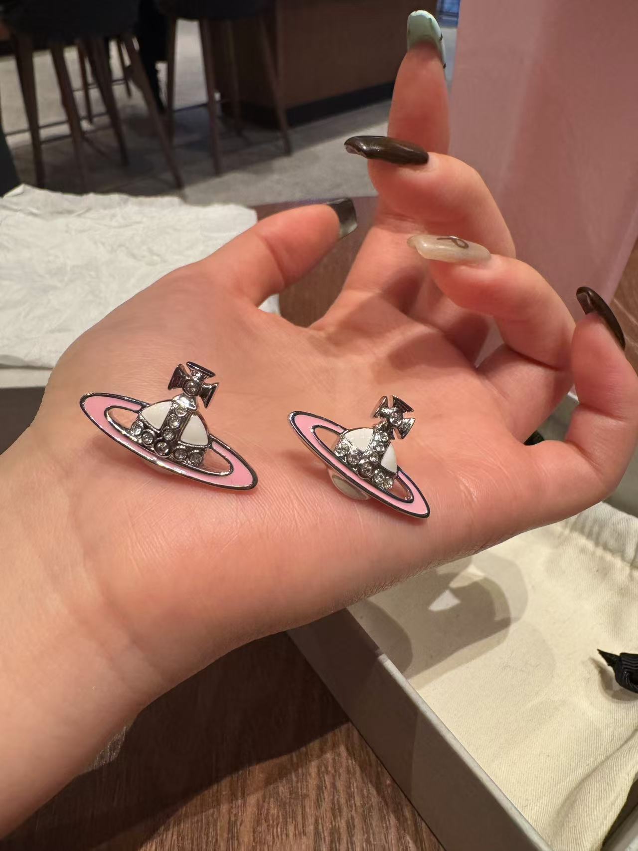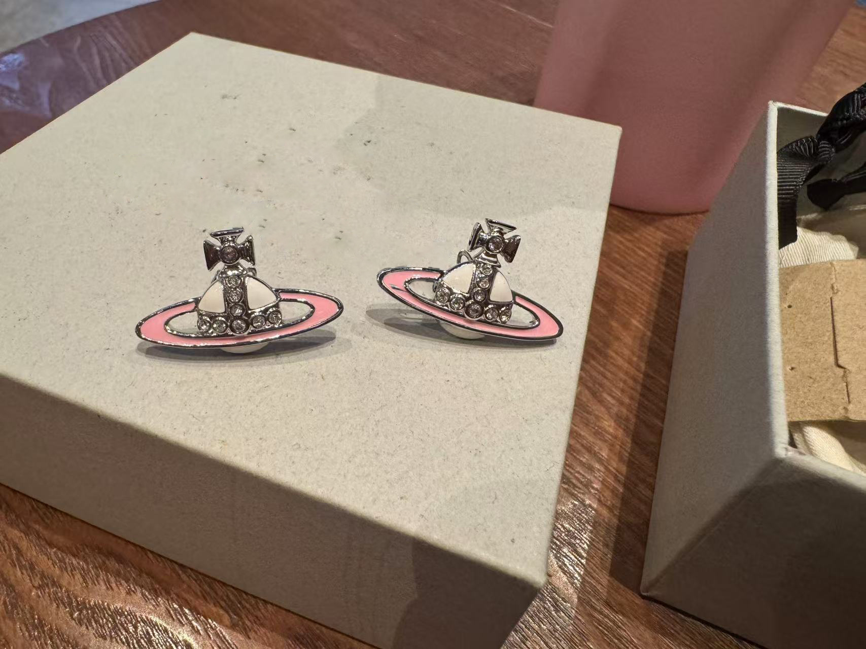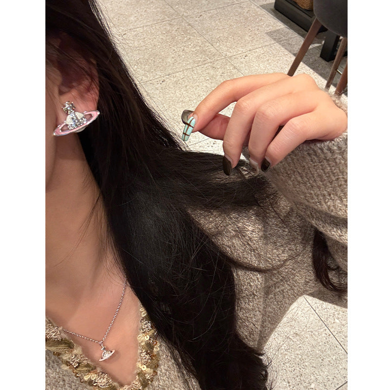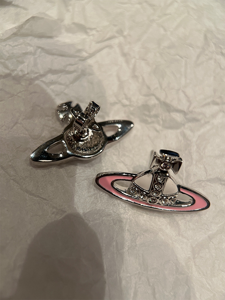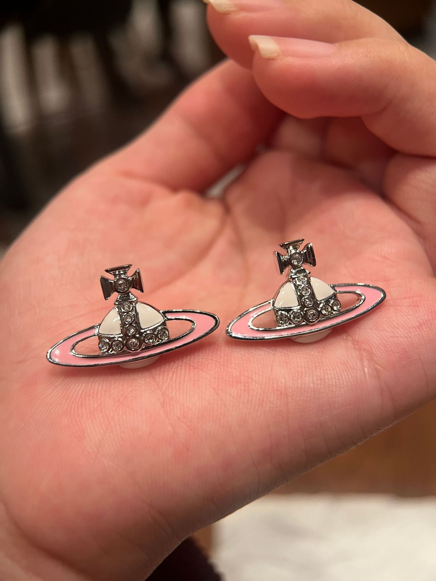 Queen West pink and white enamel Saturn stud earrings Seiko two-tone lacquer diamond orb earrings versatile everyday model
