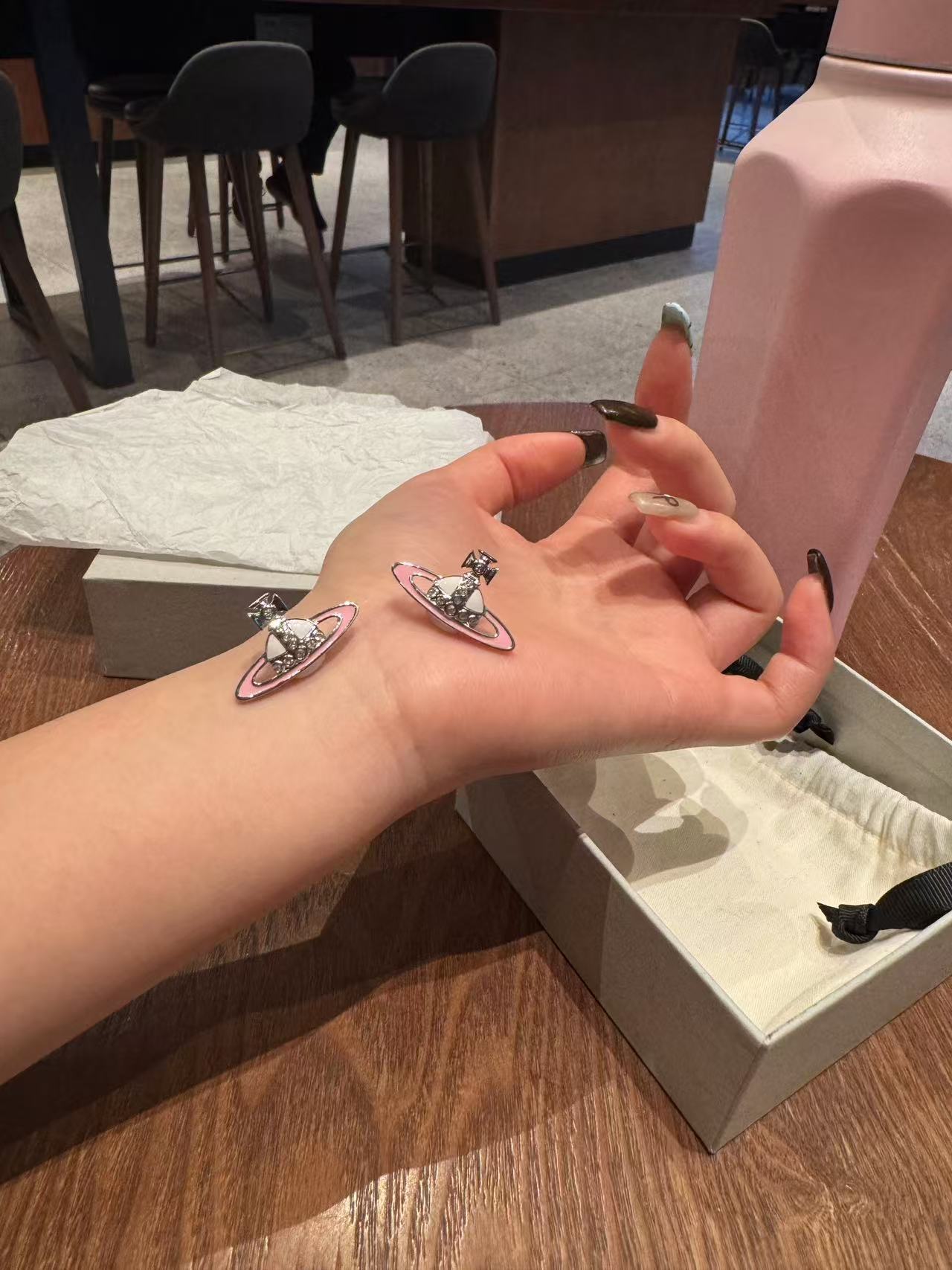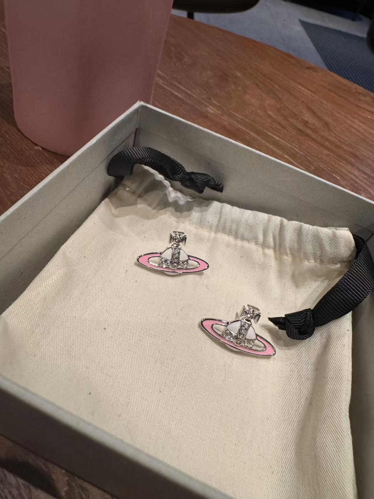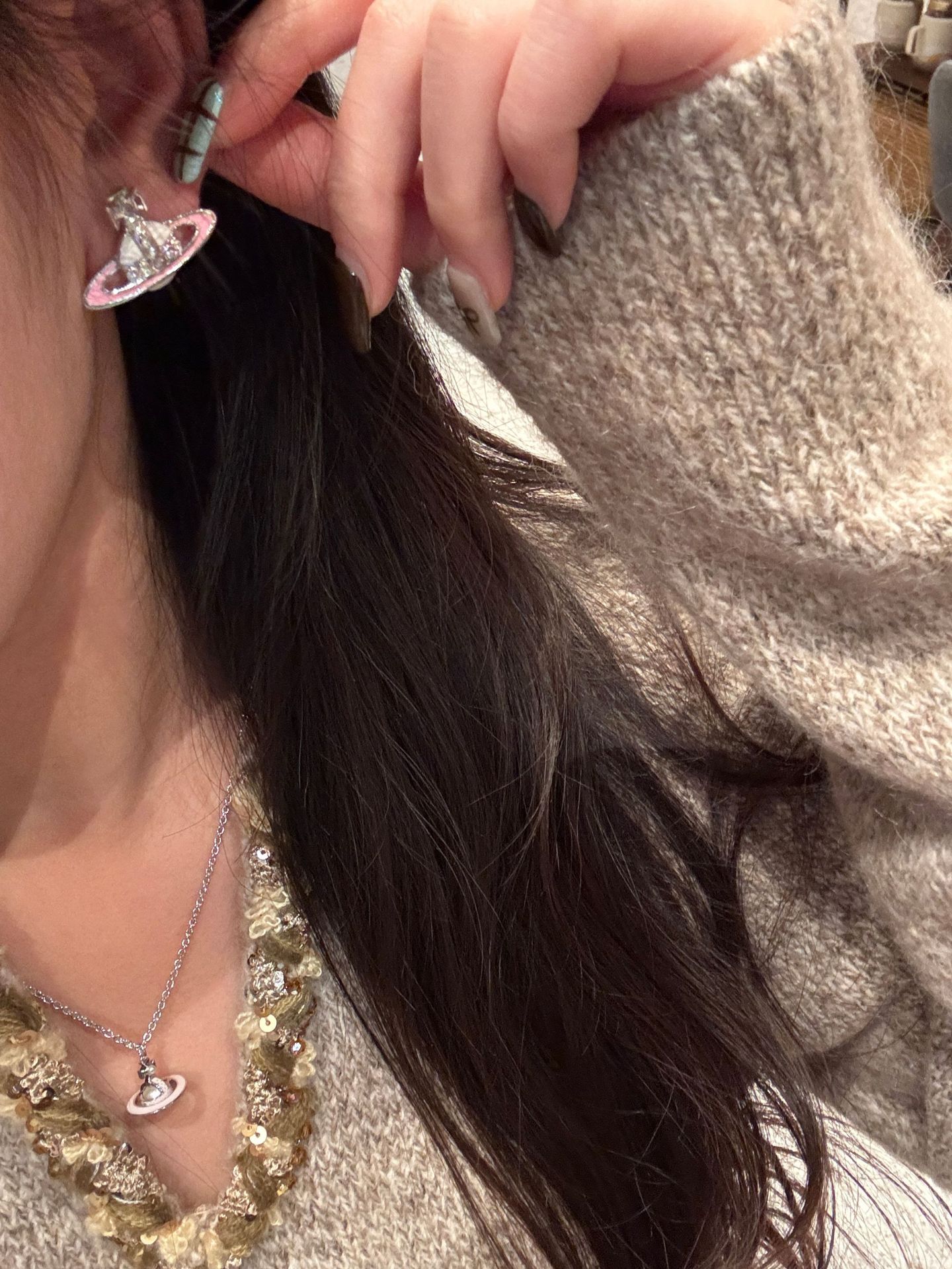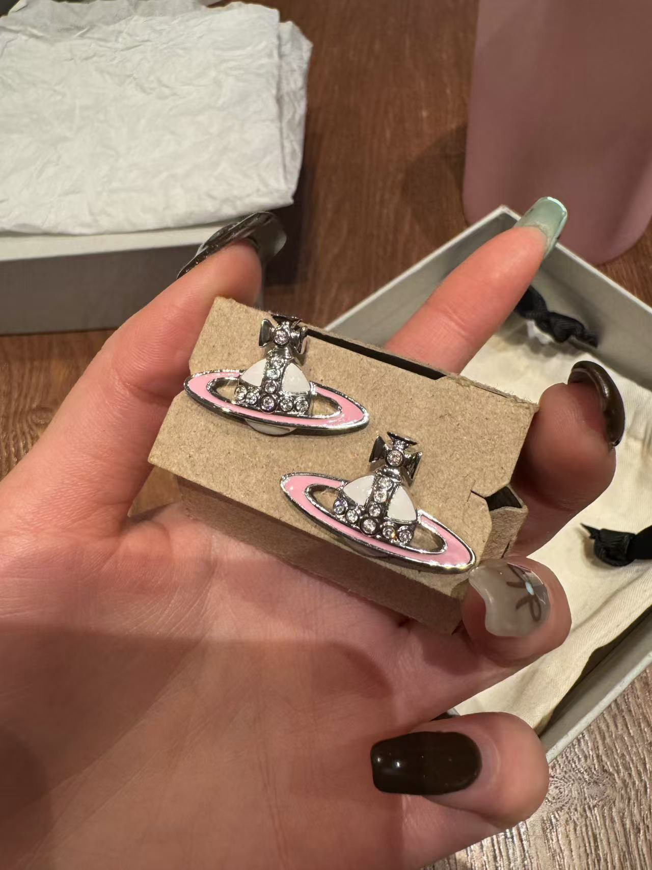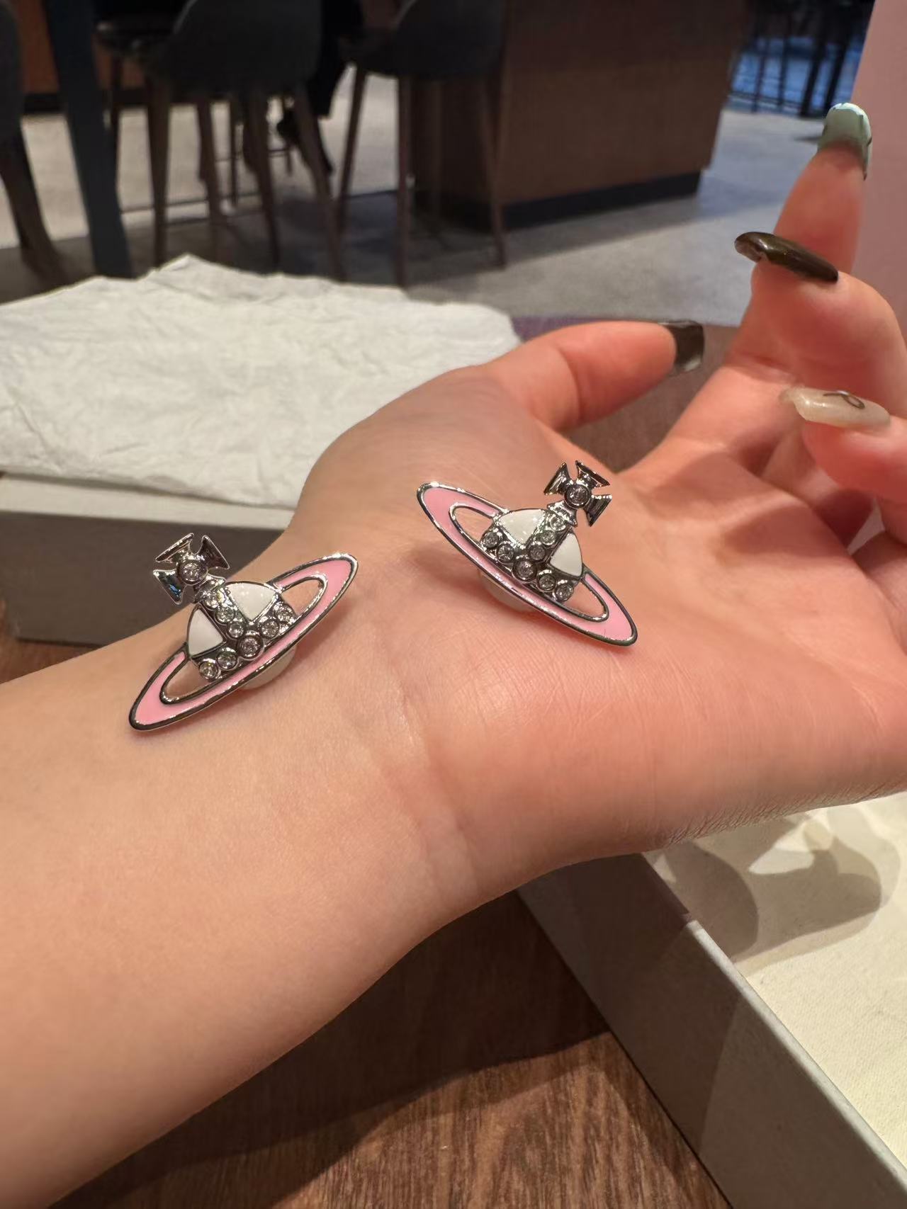 Queen West pink and white enamel Saturn stud earrings Seiko two-tone lacquer diamond orb earrings versatile everyday model