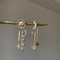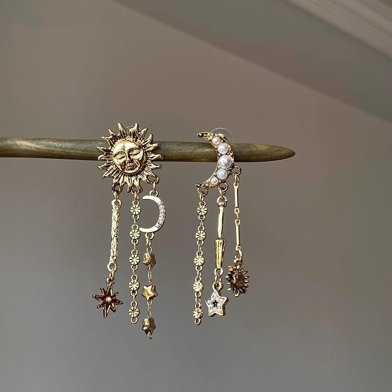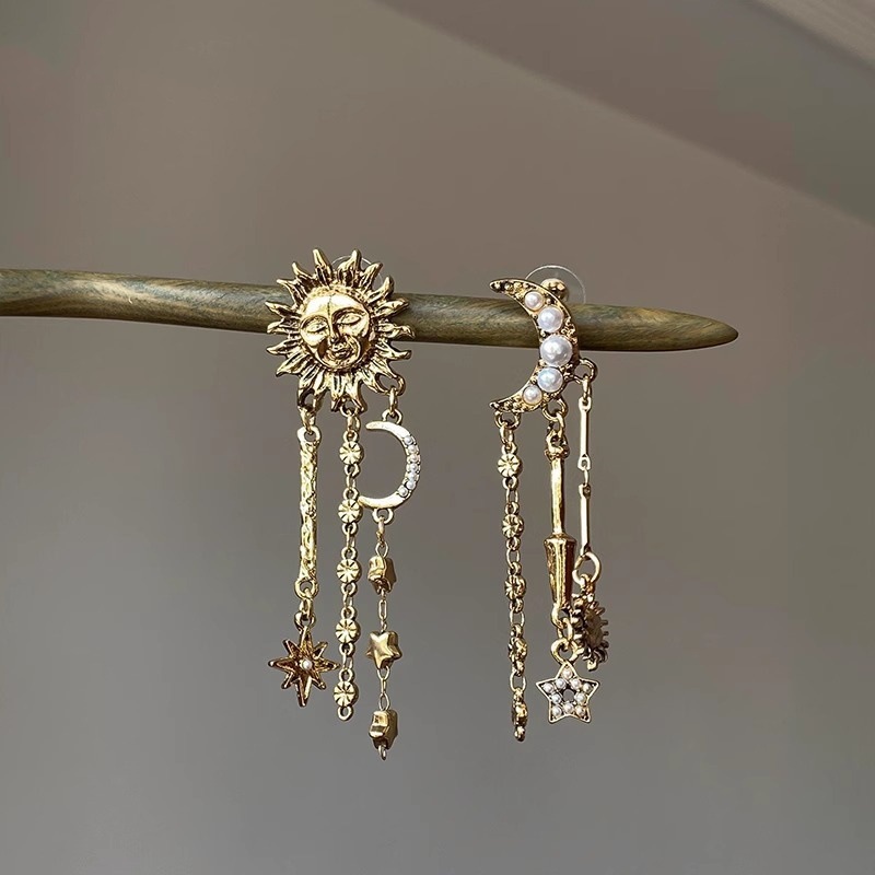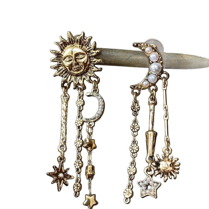Retro gold sun moon fringed stud earrings female personality exaggerated style creative earrings fashion long temperament earrings