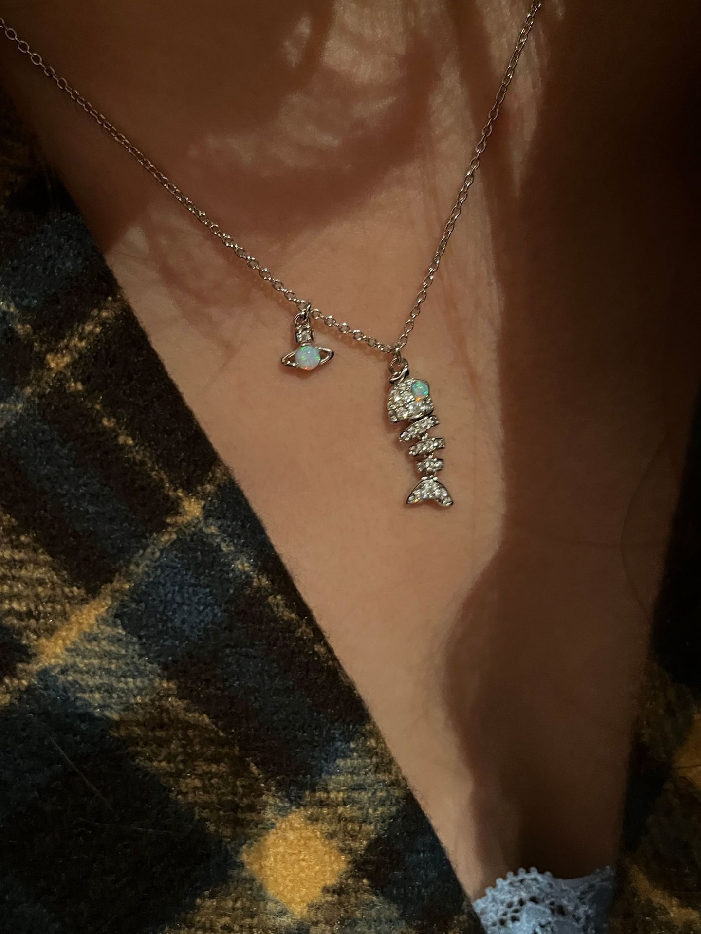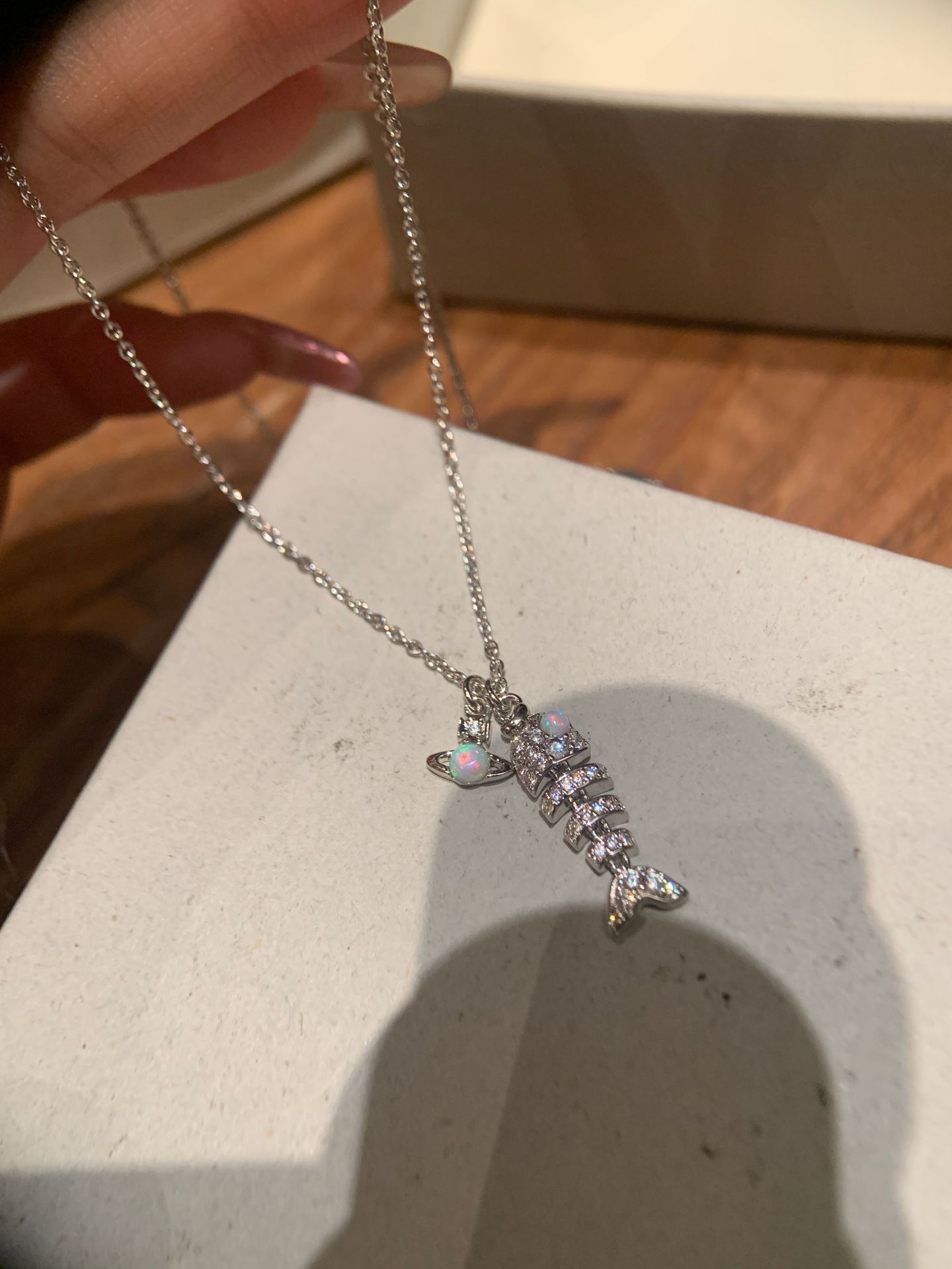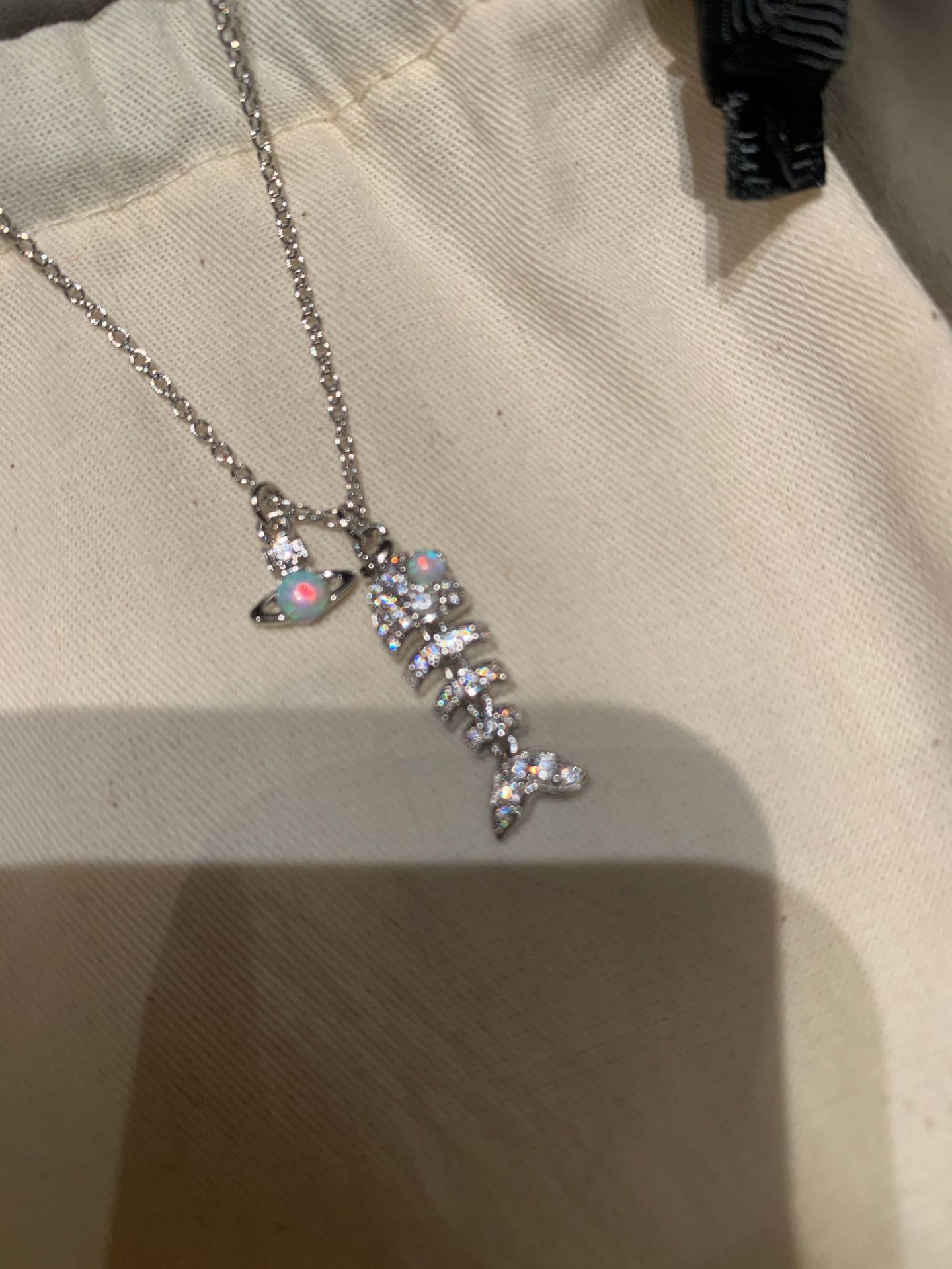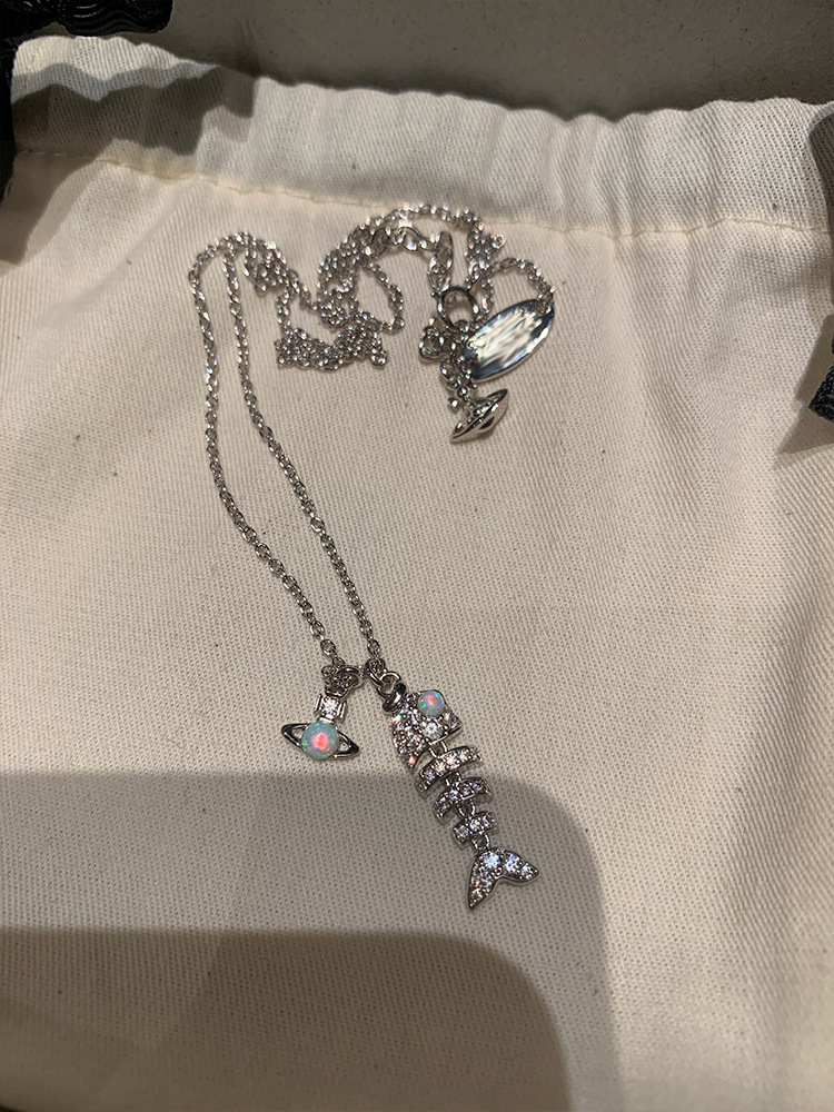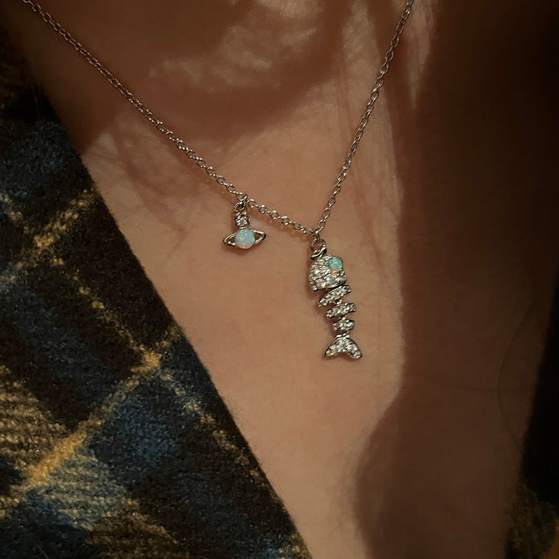 Seiko West Queen Mother Fishbone Saturn Necklace Full of Diamonds Smart Small Fish Bone Opal Stone Clavicle Chain New Necklace