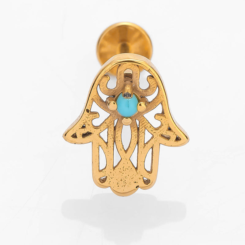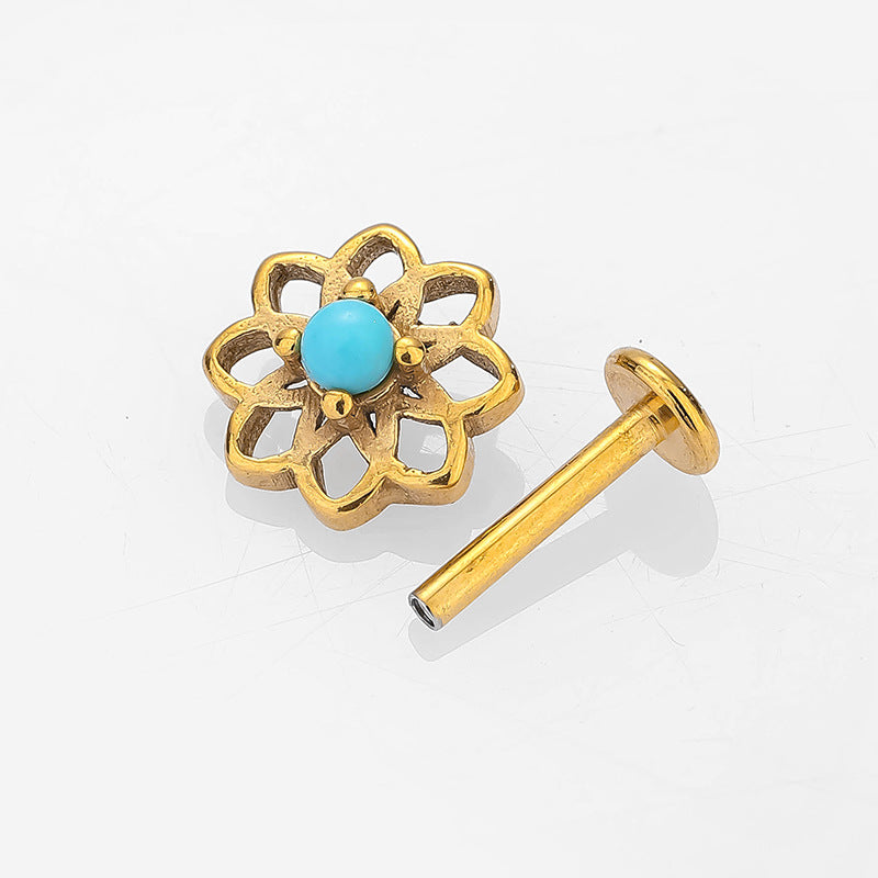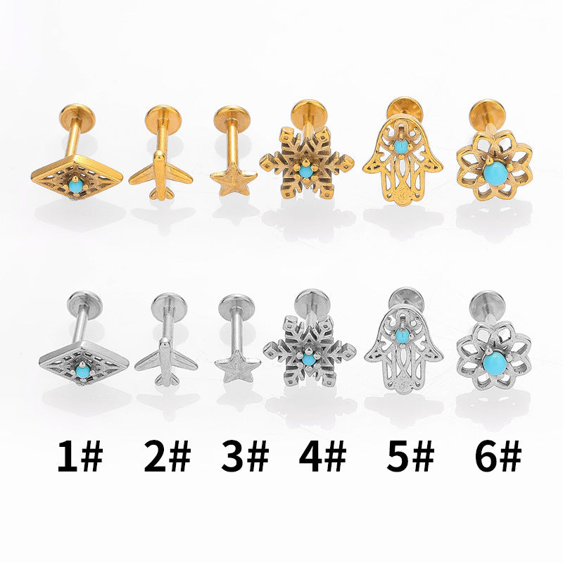 Stainless steel flat bottom rod retro turquoise hollow flower lip stud earbone stud European and American foreign trade piercing earrings lip decoration