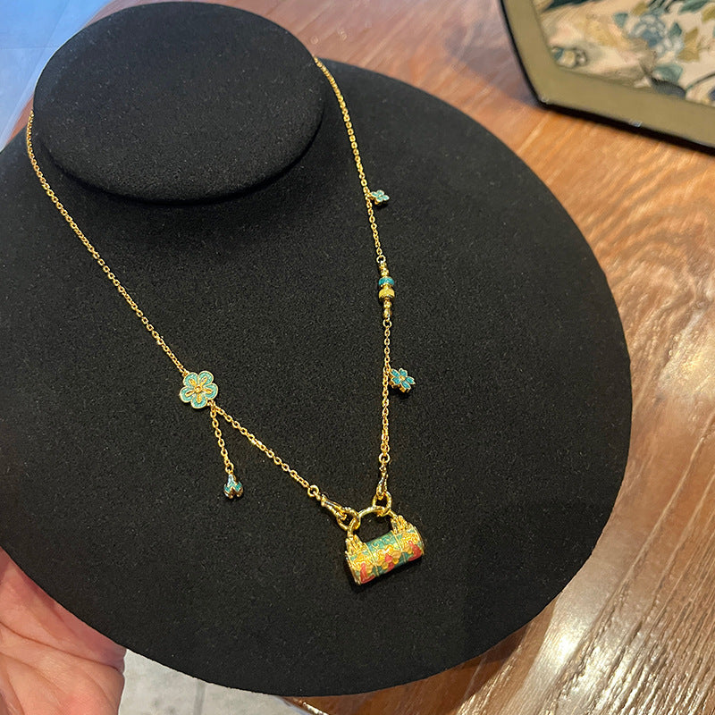The live broadcast hit the ancient method of burning blue Ping'an longevity lock bag necklace, new Chinese enamel pendant, gold flat replacement