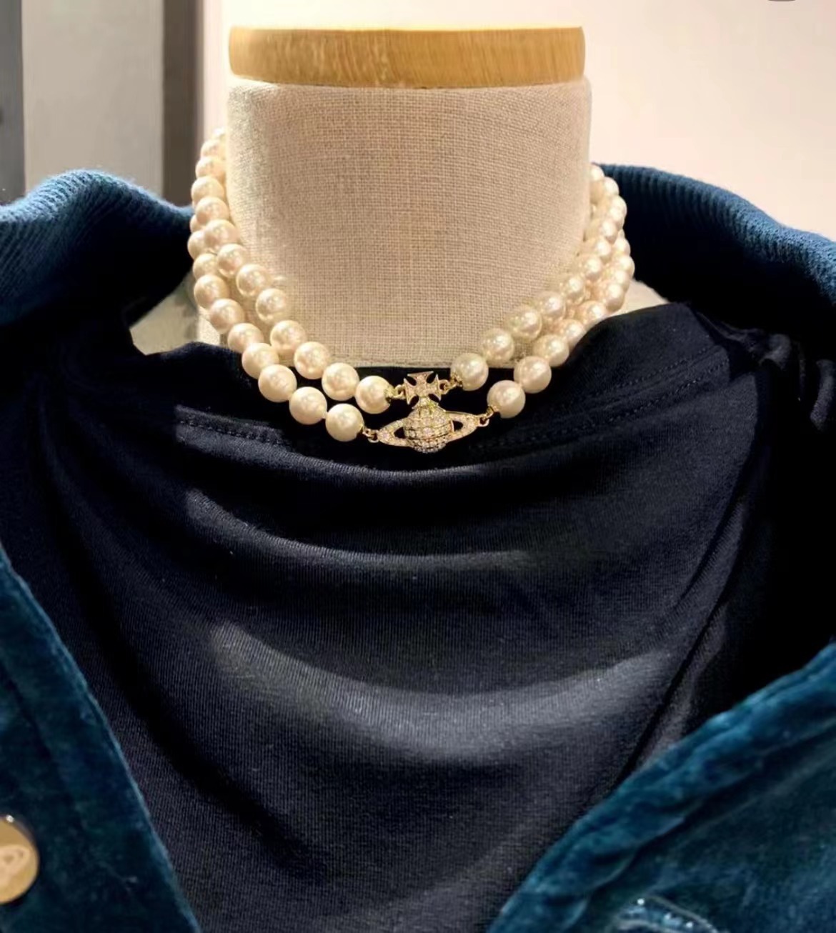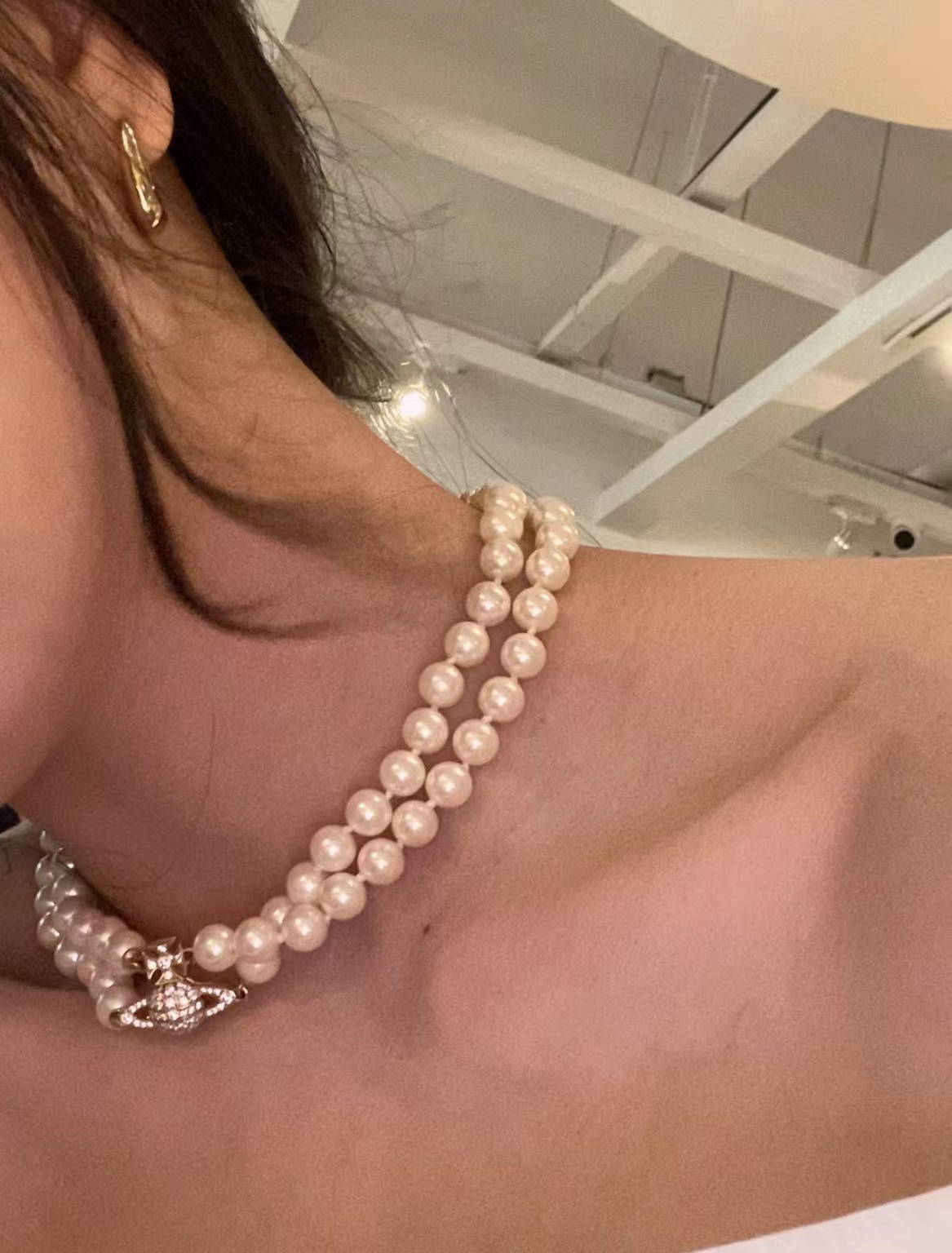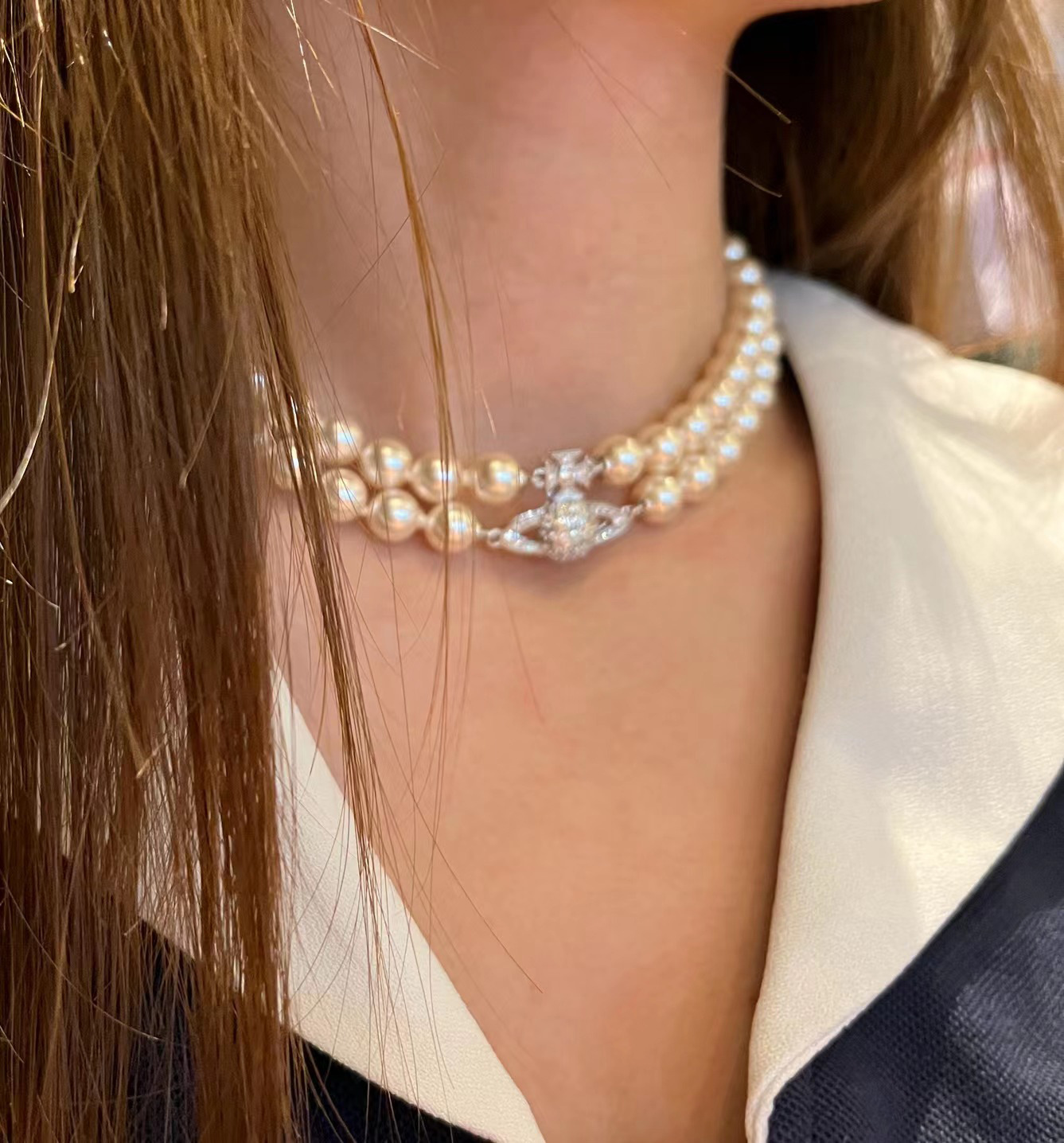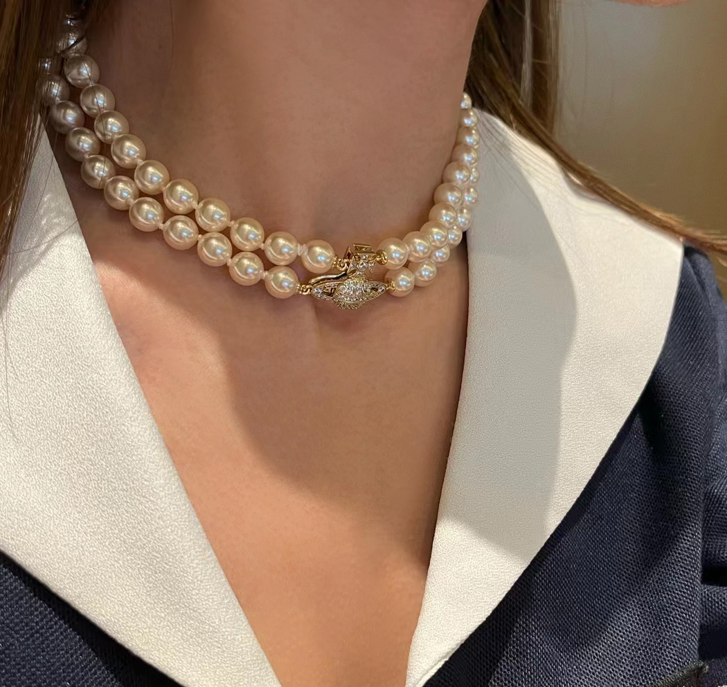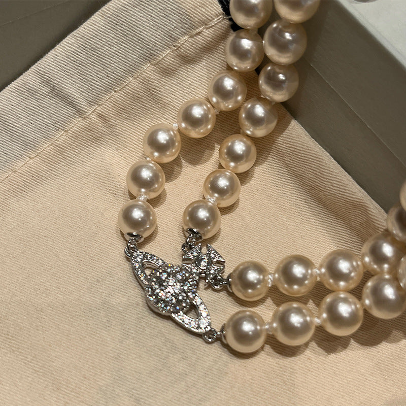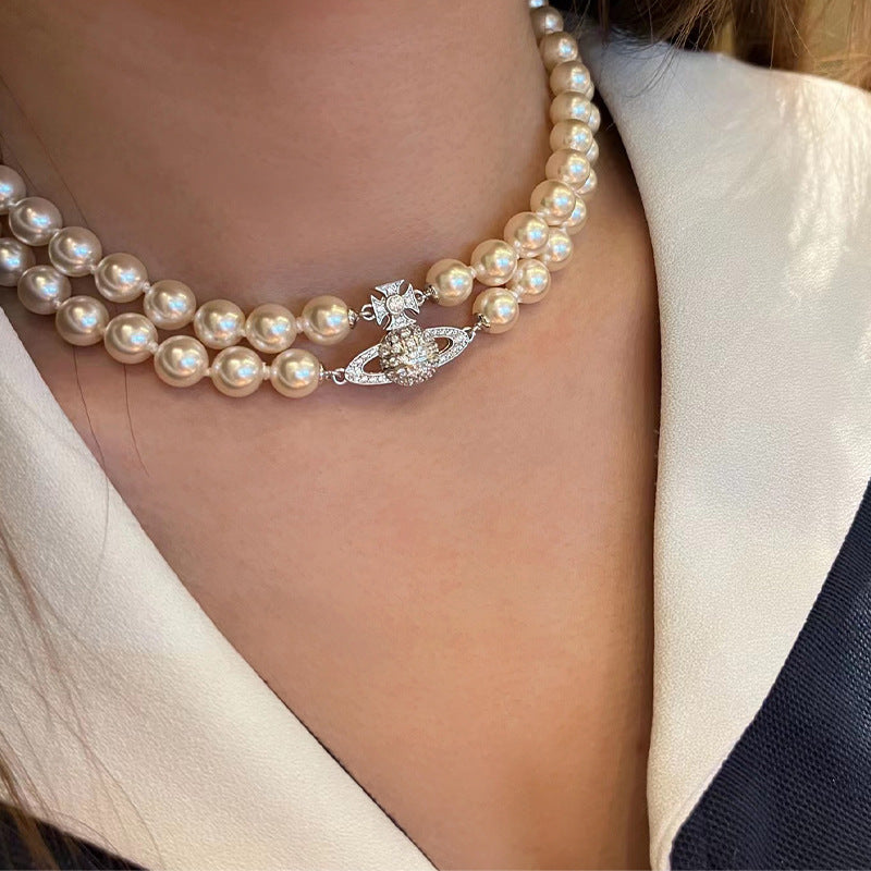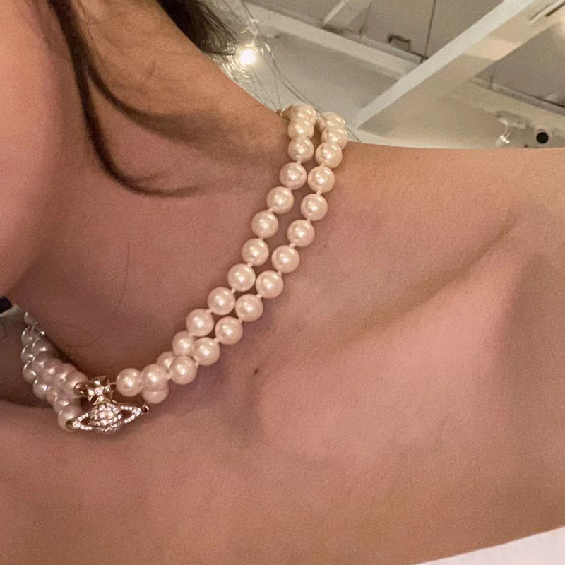 The Queen Mother of the West double-layer pearl retro vintage temperament inlaid with gold-plated diamond Saturn necklace choker